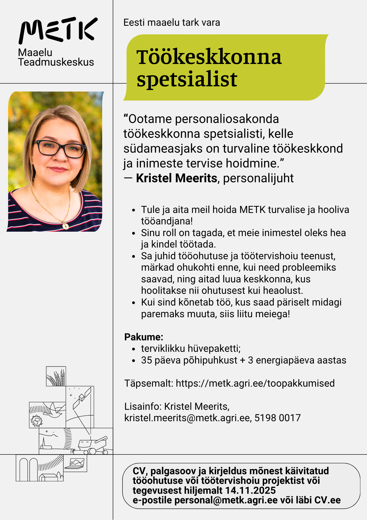 CV, palgasoov ja vabas vormis kirjeldus mõnest konkreetsest projektist või tegevusest, mille oled tööohutuse või töötervishoiu valdkonnas käima vedanud läbi CV.ee või e-postile personal@metk.agri.ee hiljemalt 14.11.2025