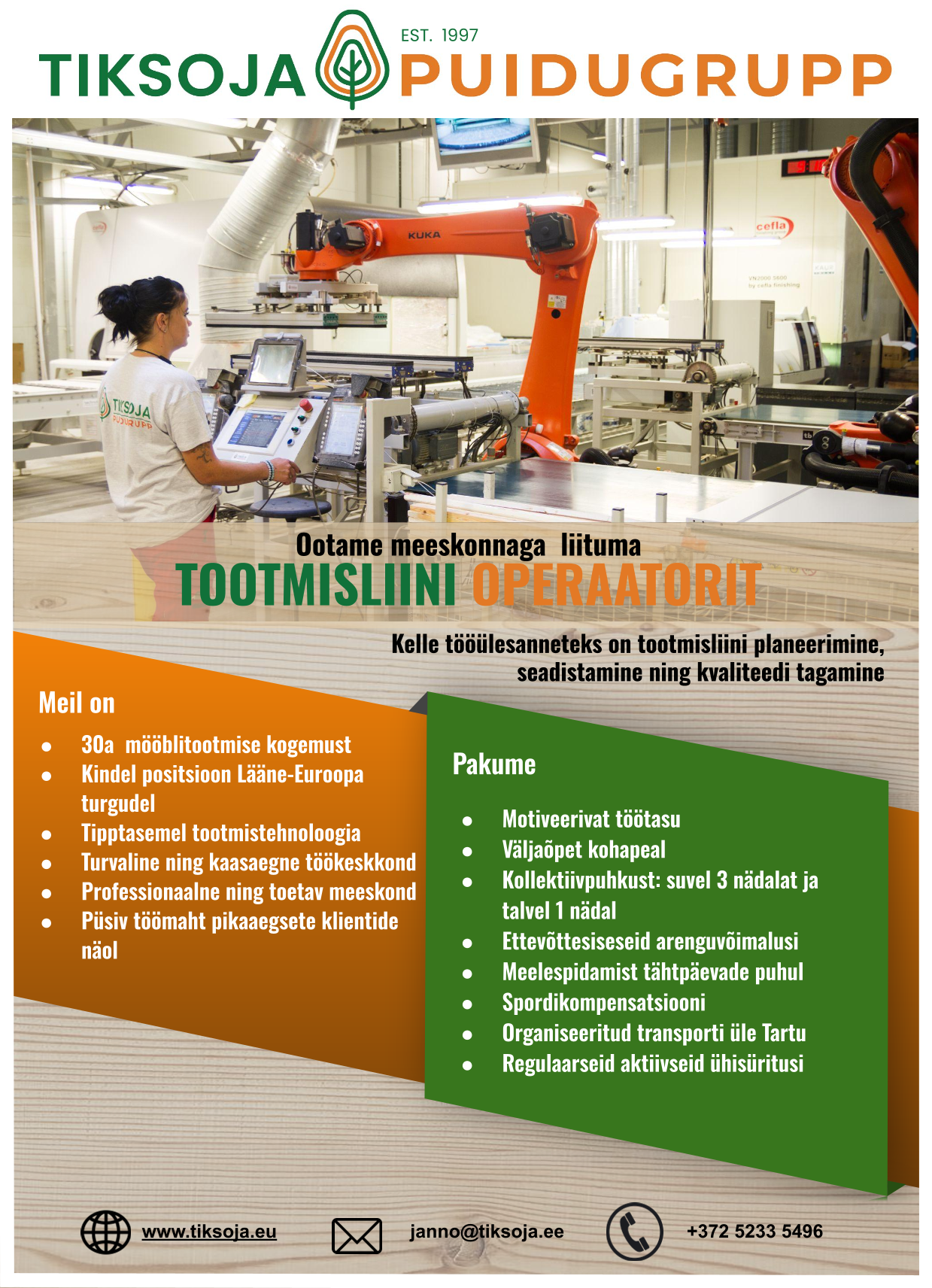 Lisahüved: Pakume stabiilset tööd, väga hea töötasuga. Lisaks sportimisvõimalusi ettevõtte siseselt ning väliselt. Lisaks transport Tartust Tiksojale ning tagasi korraldatud ettevõtte poolt.