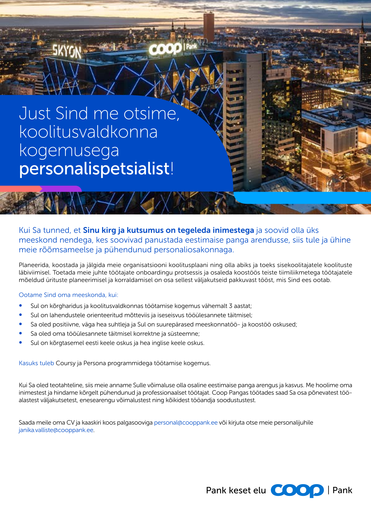Coop Pank on kiiresti kasvav eestimaine pank, mille aktsiad on noteeritud Tallinna börsil ning kuulub tuhandetele eestimaalastele. Meie sooviks on anda hoogu Eesti ettevõtetele ja aidata inimestel viia ellu oma unistus igas Eestimaa nurgas nii maal kui ka linnas. Meid iseloomustab julgus teha pangandust uuenduslikult, luues pangateenuseid, mis sobituks meie kliendi igapäevase eluga. Meie klientideks on nii eraisikud kui ka ettevõtted, kellele oleme head ja usaldusväärsed panganduspartnerid.