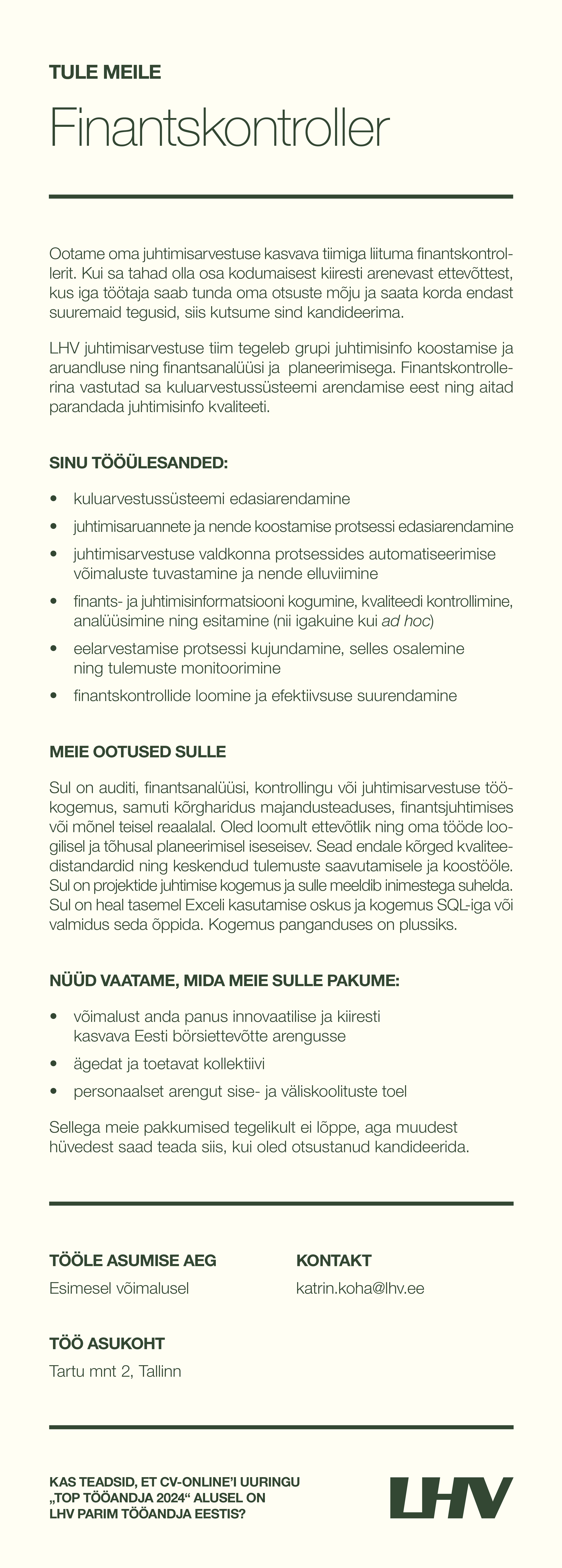 LHV Group on suurim kodumaine finantskontsern ja kapitali pakkuja Eestis. LHV Groupi peamised tütarettevõtted on LHV Pank, LHV Varahaldus, LHV Kindlustus ja LHV Bank Limited. Grupi ettevõtetes töötab üle 1100 inimese. LHV pangateenuseid kasutab mai lõpu seisuga 435 000 klienti, LHV hallatavatel pensionifondidel on 119 000 aktiivset klienti ja LHV Kindlustusega on kaitstud 168 000 klienti. Groupi tütarettevõte LHV Bank omab Ühendkuningriigi pangalitsentsi ning pakub pangateenuseid rahvusvahelistele finantstehnoloogia ettevõtetele ja laenusid väikese ja keskmise suurusega ettevõtetele.