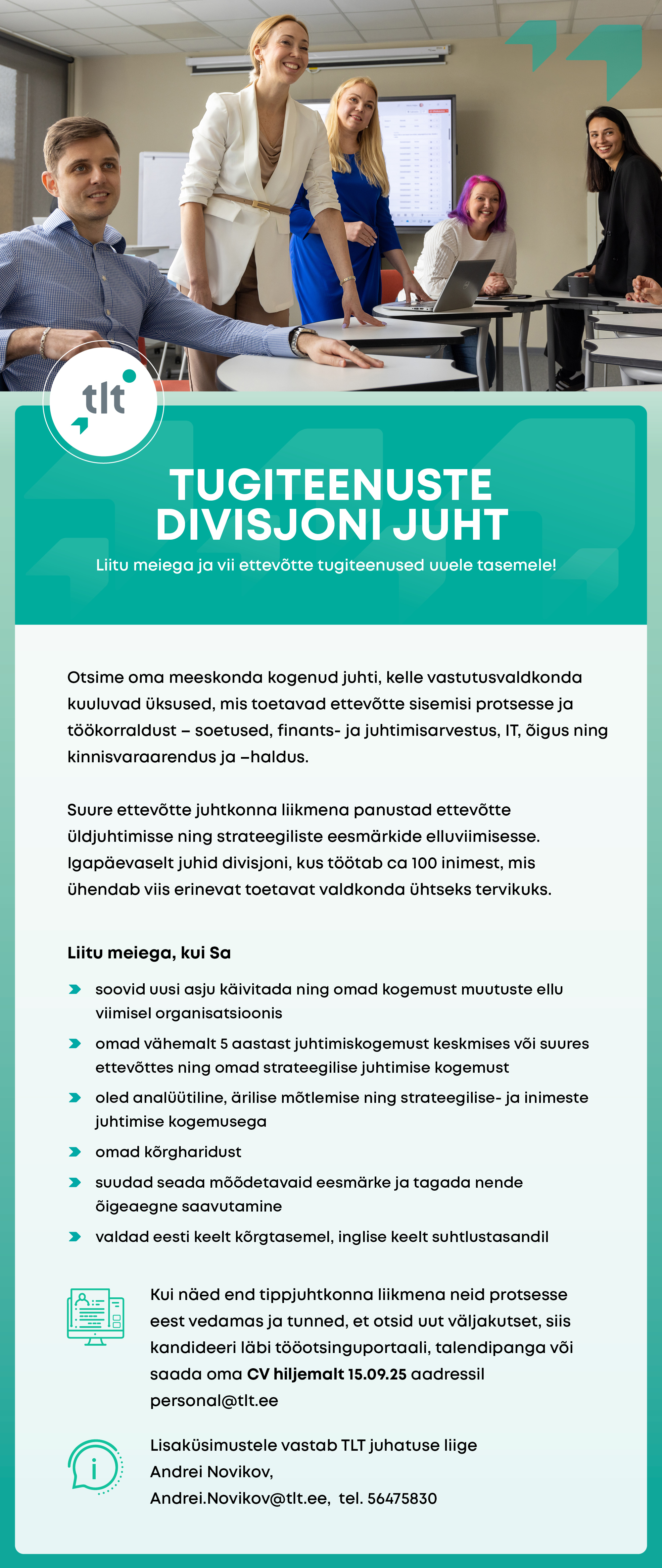 Tallinna Linnatransport (TLT) on suurim ühistranspordiettevõte Eestis. Meie põhitegevuseks on bussi-, trolli-, ja trammiliiklusteenuse osutamine Tallinnas. Meie eesmärk on muuta inimeste liikumine pealinnas võimalikult mugavaks ja samal ajal keskkonnasõbralikuks – pakume alternatiivi isiklikule autole, et ükski toimetus või käik ei jääks tegemata. Liitu TLT perega ja anna oma panus tuleviku ühistranspordi kujundamisse https://tlt.ee/ettevottest/karjaar/