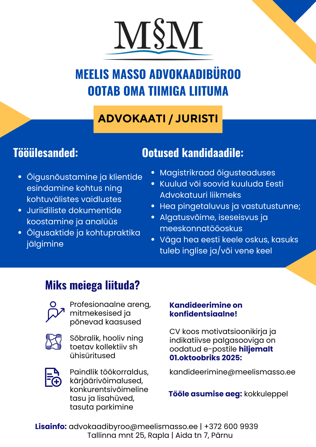 Oleme kaasaegne, klassikaline ja arenev Kesk-Eesti suurim advokaadibüroo. Oleme 02.03.2017 alustanud tegevust Tallinnas ja jõudnud tänaseks Rapla ja Pärnu linna. Me nõustame oma kliente ning osutame advokaaditeenuseid kõigis peamistes õigusvaldkondades. Meie klientideks on peamiselt keskmise suurusega Eesti ja välismaised äriühingud ning eraisikud. Osutame teenuseid nii eesti, inglise, vene kui ka saksa keeles.