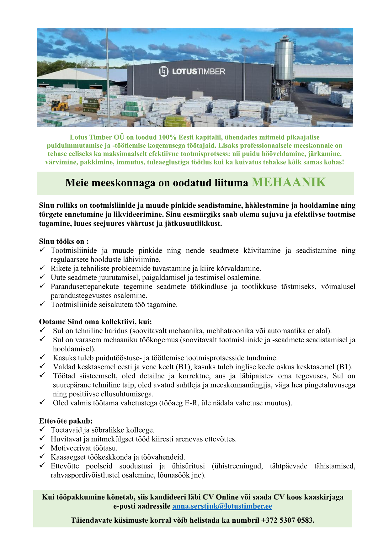 - Sul on varasem mehaaniku töökogemus (soovitavalt tootmisliinide ja -seadmete seadistamisel ja hooldamisel).