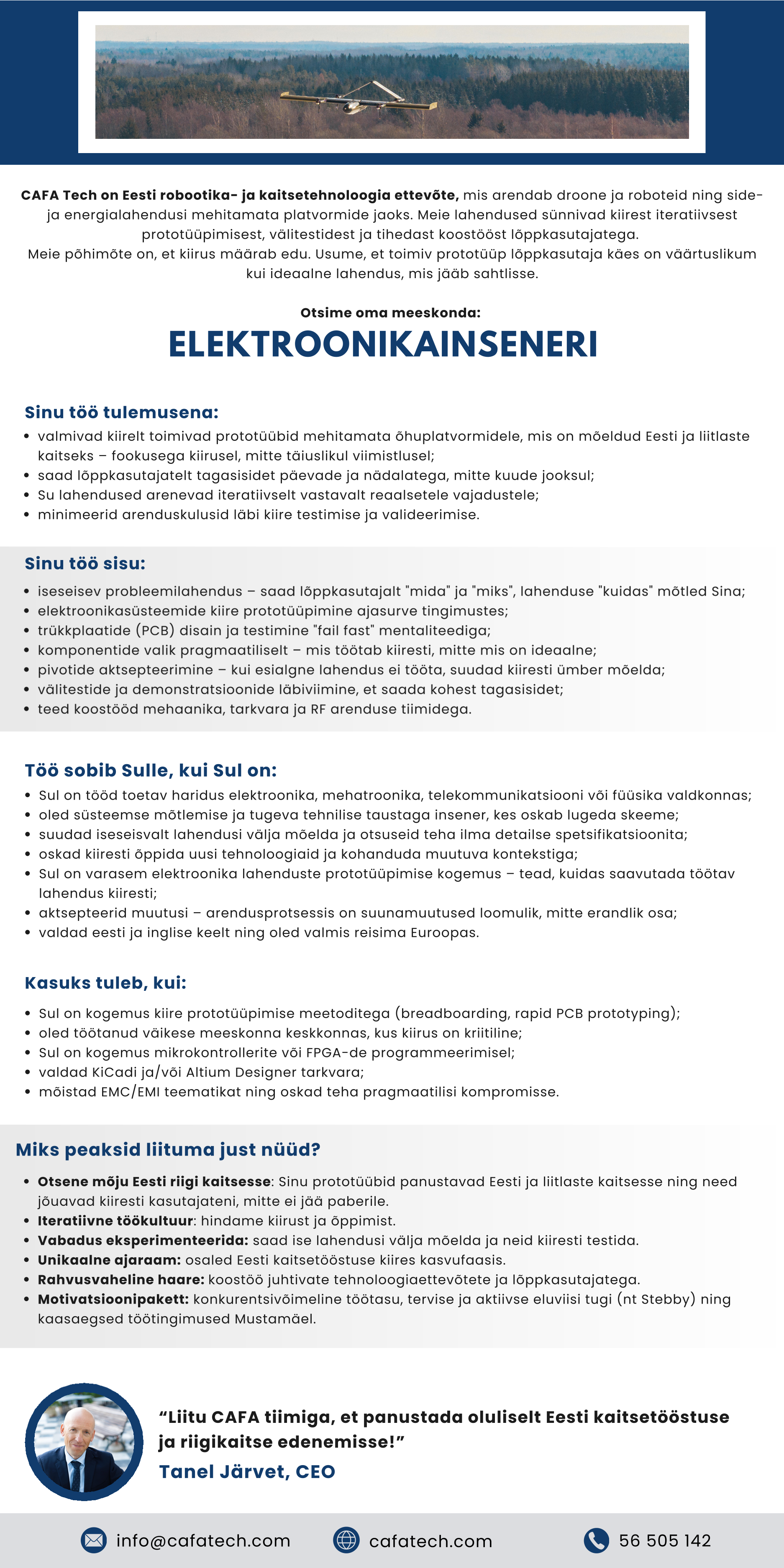 CAFA Tech on Eesti robootika- ja kaitsetehnoloogia ettevõte, mis arendab droone ja roboteid ning sideja energialahendusi mehitamata platvormide jaoks. Meie lahendused sünnivad kiirest iteratiivsest prototüüpimisest, välitestidest ja tihedast koostööst lõppkasutajatega. Meie põhimõte on, et kiirus määrab edu. Usume, et toimiv prototüüp lõppkasutaja käes on väärtuslikum kui ideaalne lahendus, mis jääb sahtlisse.