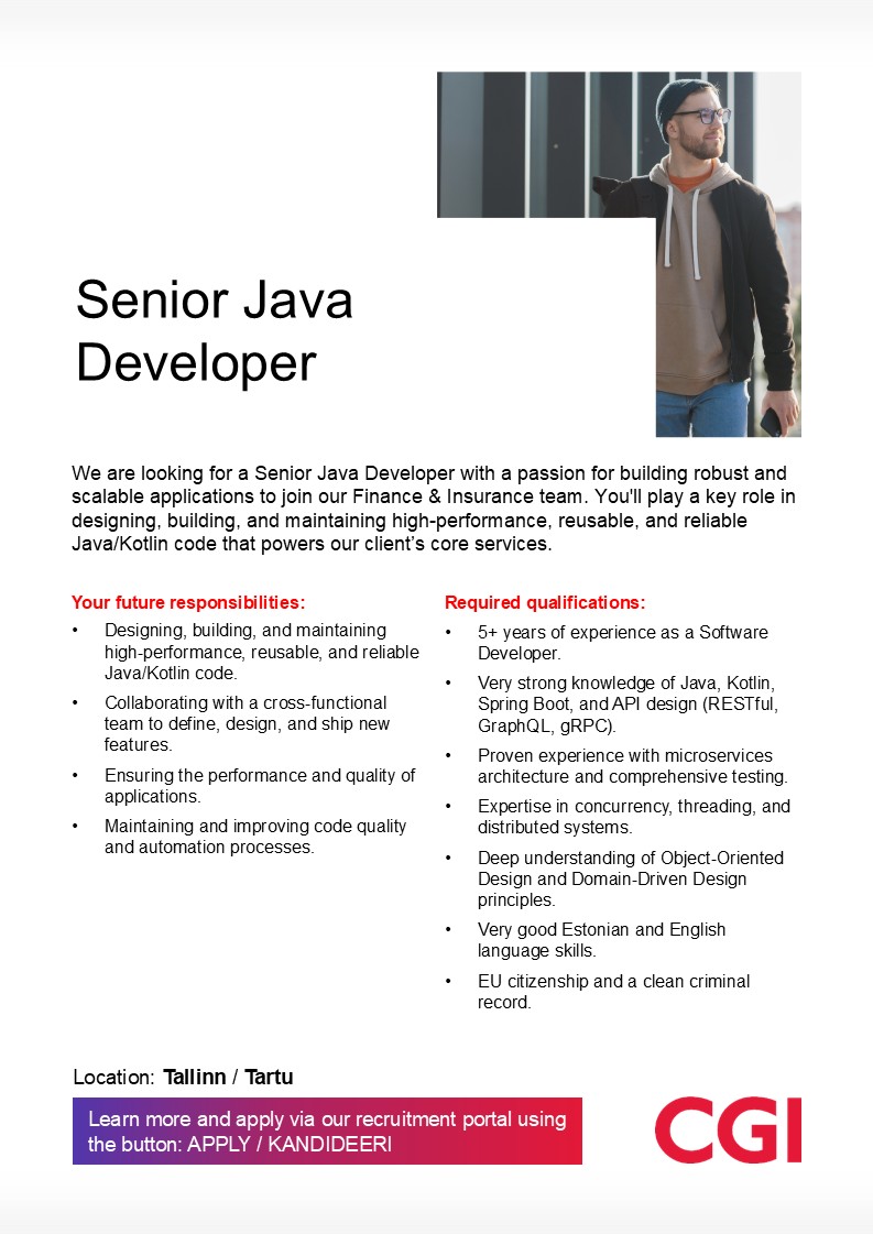 CGI pakub enamat kui lihtsalt töökohta. Pakume võimalust olla osa meie klientide ärist, aidates neil ellu viia olulisi muudatusi. Kui Sulle on oluline töö kvaliteet, pühendunud kolleegid, Sind ümbritsev ühiskond ja põnevad väljakutsed liitu CGI-ga!