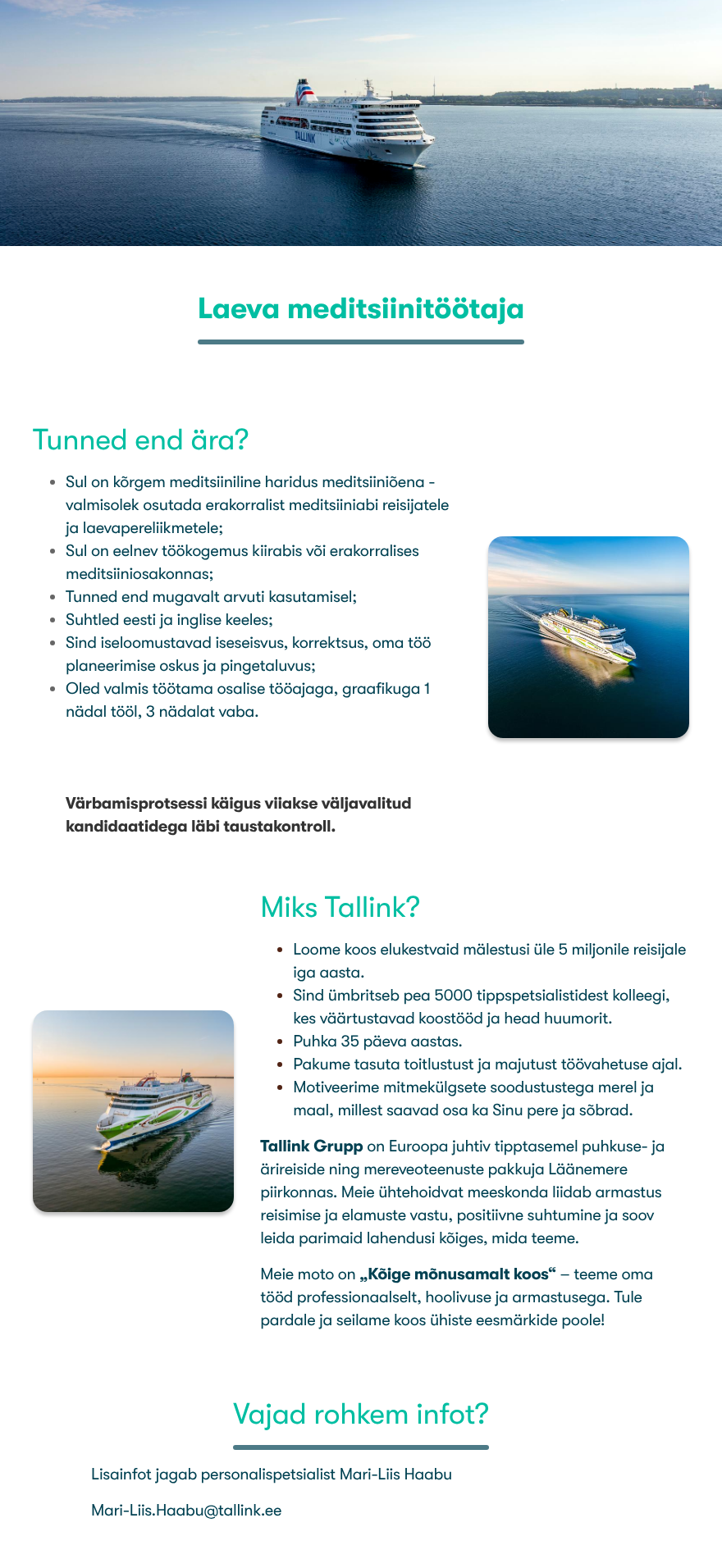 Tallink on Läänemere suurim ja edukaim reisilaevandusfirma. Tallink on Eesti hingega põhjamaine ettevõte, mis on rahvusvahelise kontsernina esindatud Eestis, Soomes, Rootsis, Lätis ja Saksamaal. Laevanduse kõrval on meil aastakümnete pikkune kogemus nii hotellinduses, jaekaubanduses, meelelahutuses, restoraniäris ja muuski. Äritegevuses seame esikohale jätkusuutlikkuse ning peame oluliseks mööndusteta kvaliteeti.