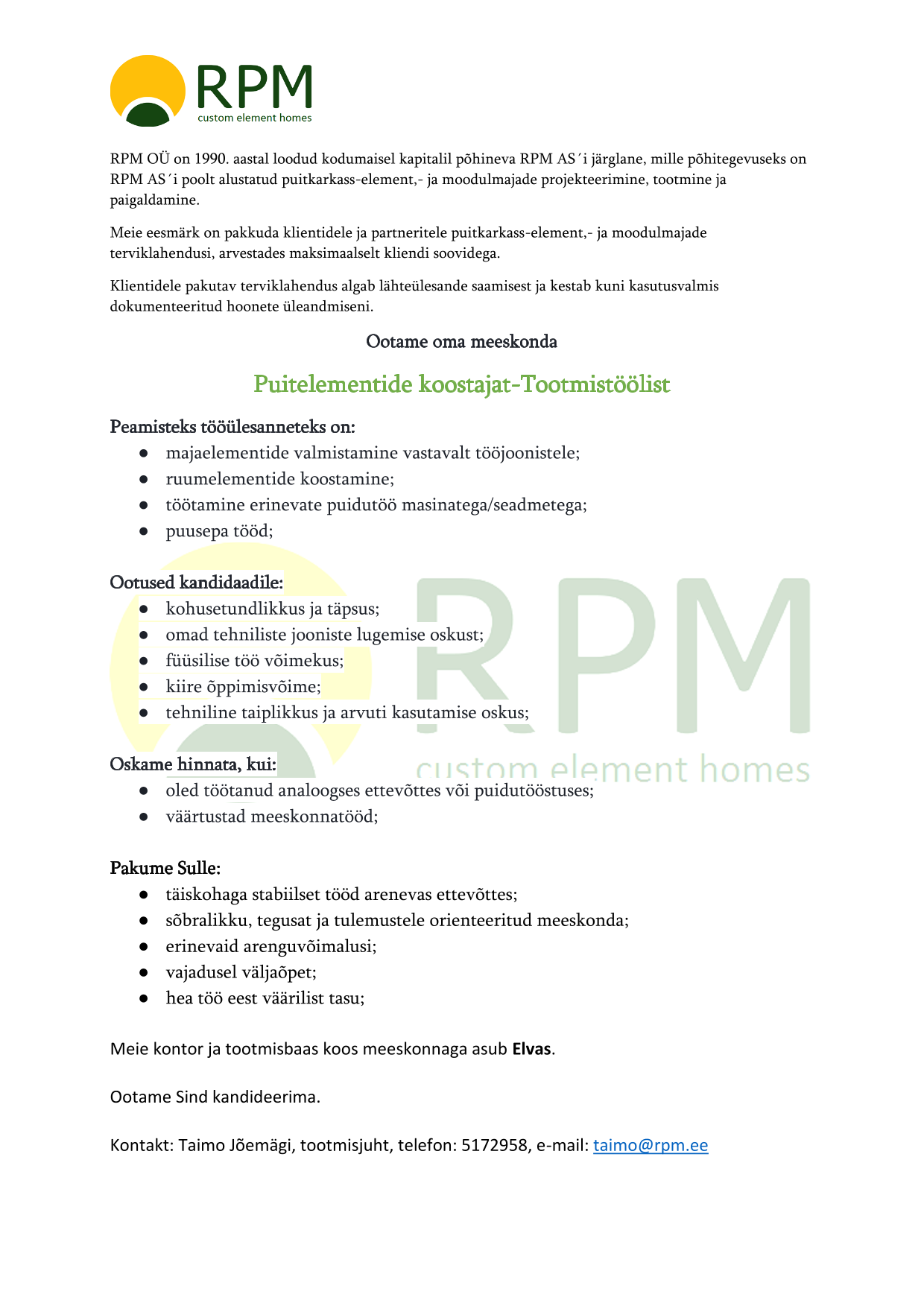 RPM OÜ on 1990. aastal loodud kodumaisel kapitalil põhineva RPM AS´i järglane, mille põhitegevuseks on RPM AS´i poolt alustatud puitkarkass-element,- ja moodulmajade projekteerimine, tootmine ja paigaldamine.