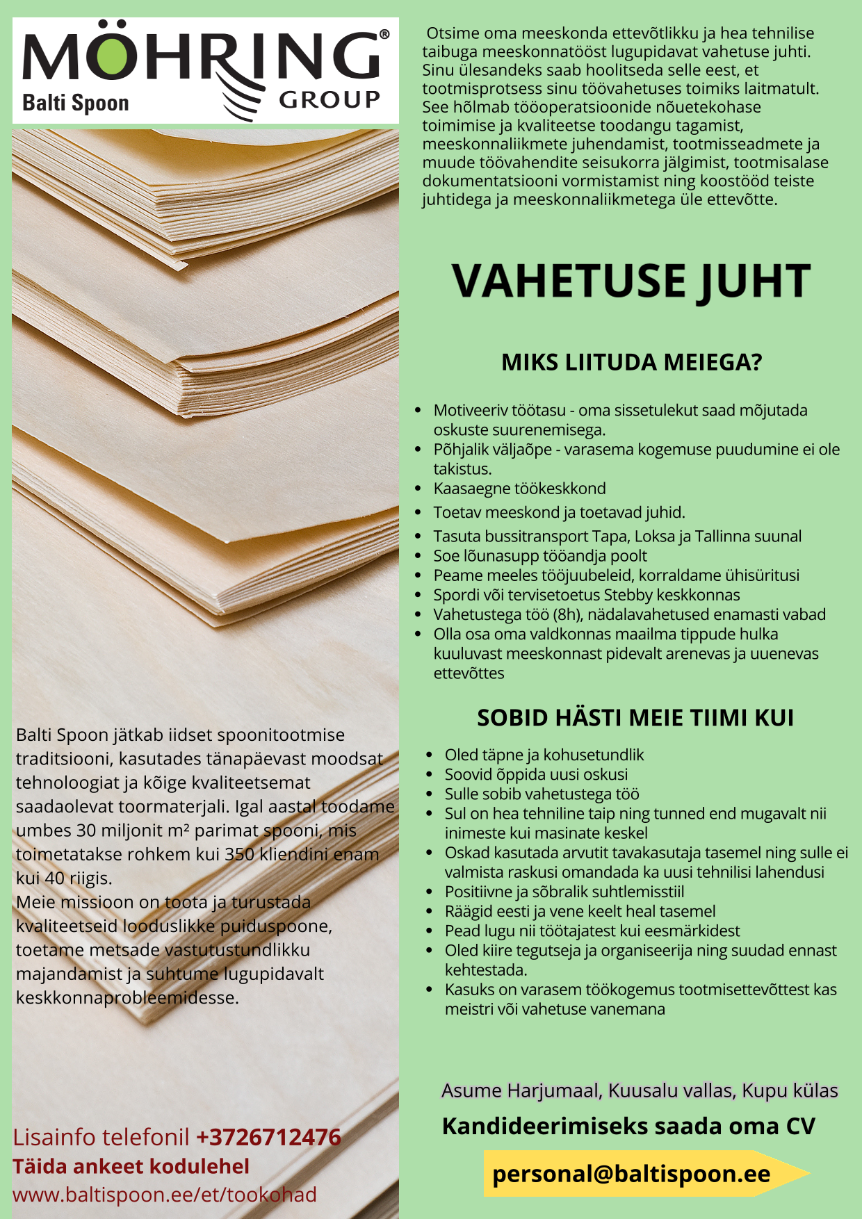 Meie rahvusvahelises meeskonnas töötab ligikaudu 300 inimest, kellest paljud on väga pikajalise kogemusega spoonitootmise eksperdid. Väärtustame turvalist töökeskkonda ja ausaid töösuhteid.
