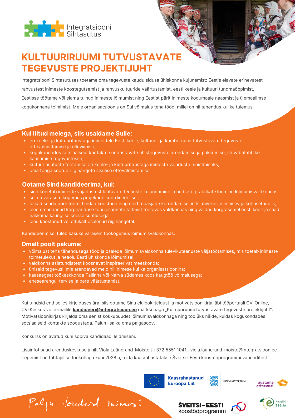 - eri keele- ja kultuuritaustaga inimestele Eesti keele, kultuuri- ja komberuumi tutvustavate tegevuste ettevalmistamise ja elluviimise;