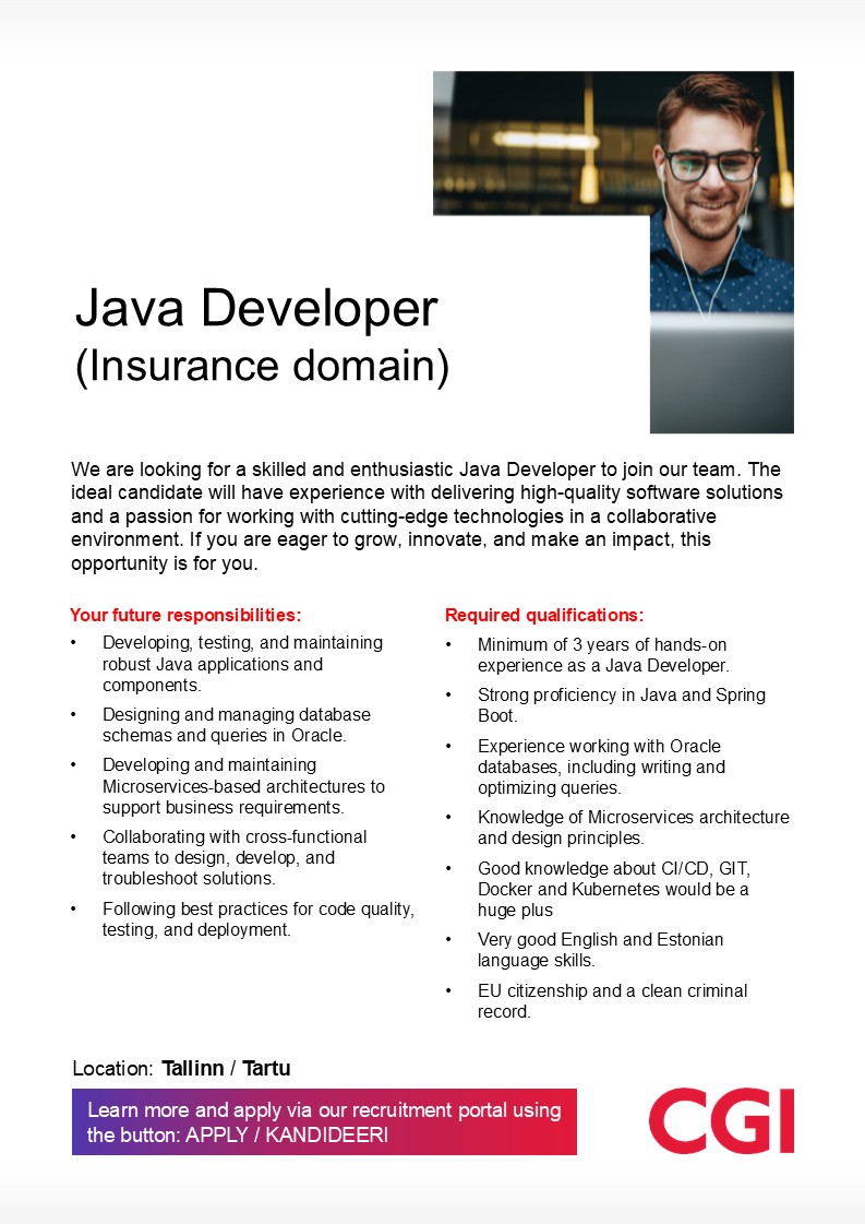 CGI pakub enamat kui lihtsalt töökohta. Pakume võimalust olla osa meie klientide ärist, aidates neil ellu viia olulisi muudatusi. Kui Sulle on oluline töö kvaliteet, pühendunud kolleegid, Sind ümbritsev ühiskond ja põnevad väljakutsed liitu CGI-ga!