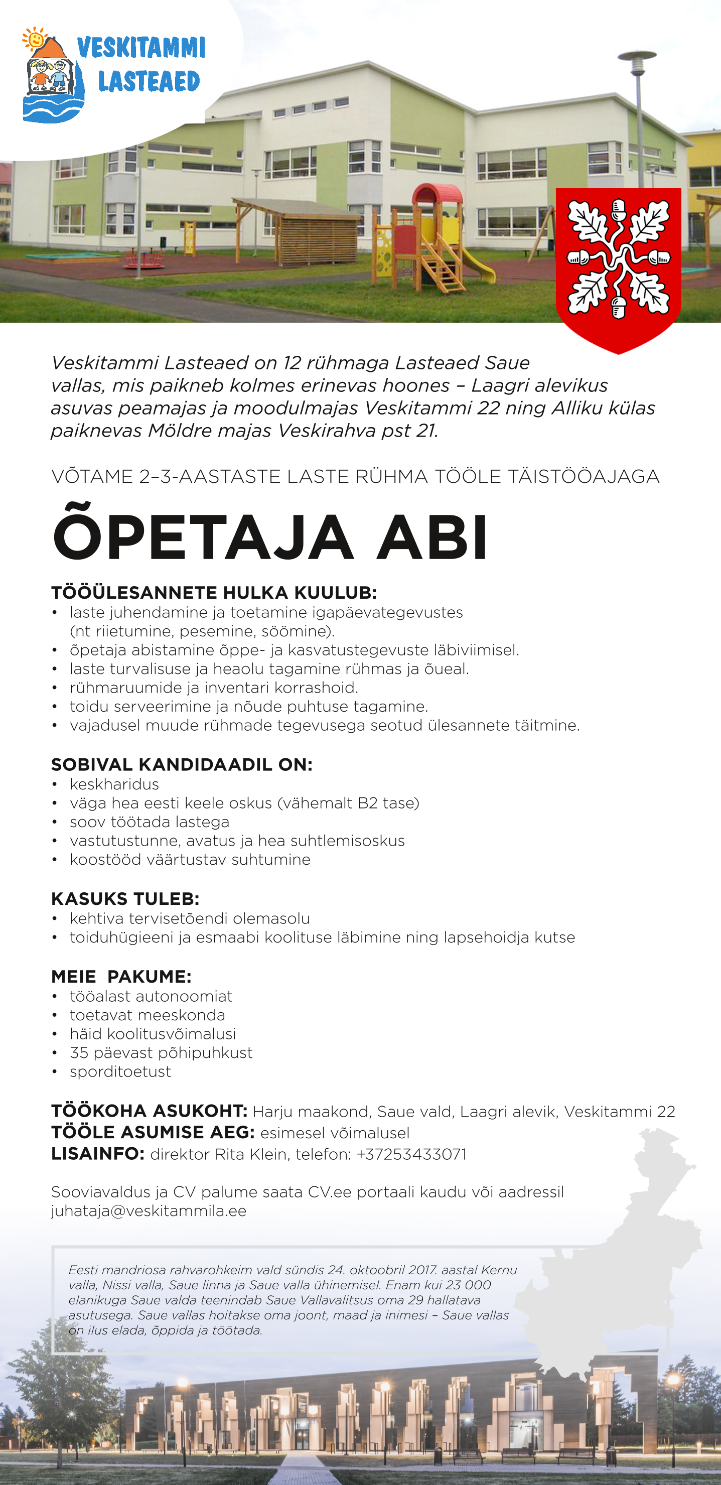 Kui sul on tahe töötada lastega ja valmisolek panustada lasteaia igapäevategevustesse, oled meeskonda oodatud!