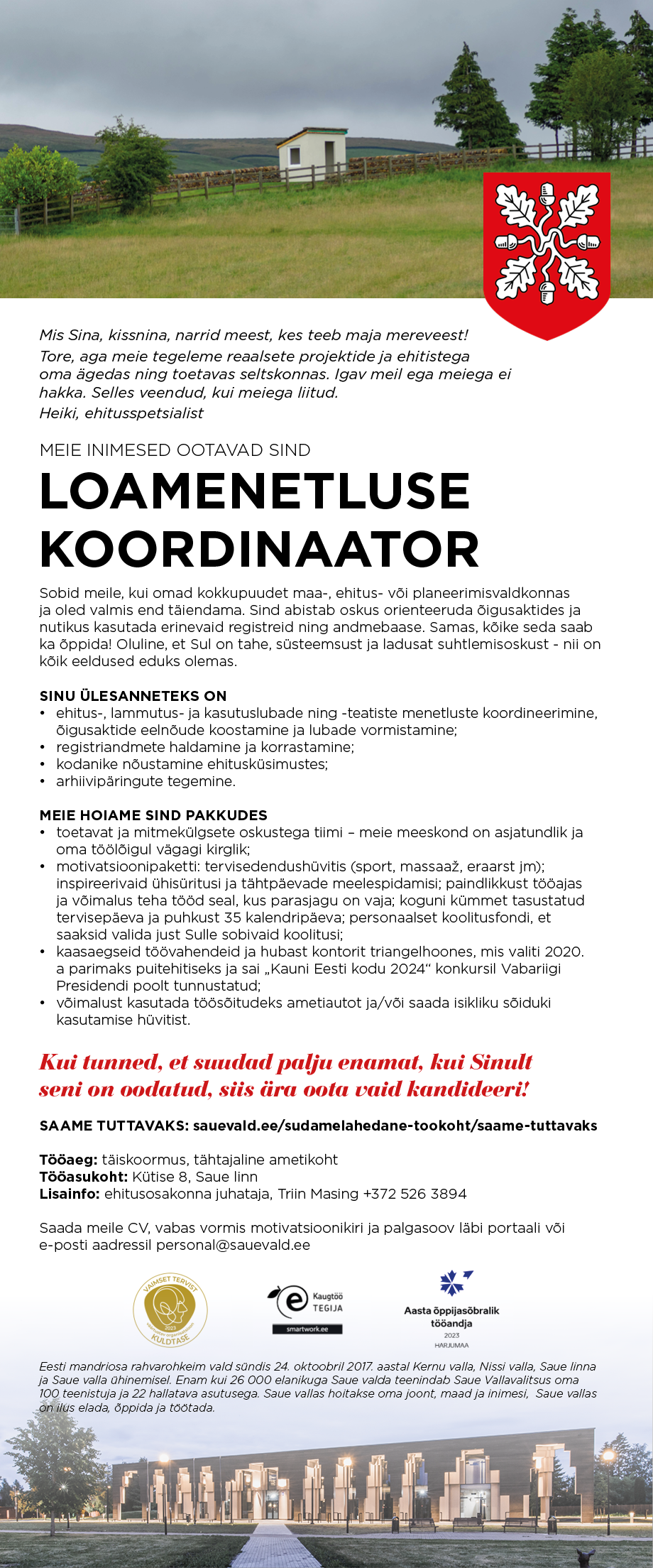 Hoiame omaHoiame oma joont, maad ja inimesi. Siin on ilus elada, õppida ja töötada.Usaldus ja turvatunneUsalduse ja turvatunde tagab kodanikulähedus ning asjatundlikkus. Hea vald on see, mis toimib võimalikult elaniku ja probleemi ligidal. See on kodulähedane, lapsi ja noori kasvatav haridussüsteem ja kindel ning parimaid võimalusi pakkuv sotsiaalhoolekandesüsteem. See on elanike arvamusega arvestav sõbralik vallavõim. Kõigile elanikele tagatakse võimalused valla elus aktiivselt osalemiseks.Ühtne ja terviklik kogukondTasakaalustatud areng ning ettevõtlikkus loovad võimalused Saue valla kui ühtse kogukonna ja elukeskkonna väärtustamiseks. Seda tunnetavad ja hindavad võrdselt kõikide valla piirkondade elanikud ja siin tegutsevad ettevõtted. Saue vald on linnalähedase elu, külaelu, põllumajandusvaldkonna ja avaliku ruumi väärtustaja. See on maa ja linna väärikas ning teineteist arvestav koostoimimine.Mõnus ja kutsuv külaliseleValla äratuntav ja eristuv kuvand on elamusi pakkuv turistidele ja huvipakkuv investoritele. Saue vallas hoolitakse inimestest, hoitakse loodust, toetatakse üksteist ja ollakse avatud uutele võimalustele. See tähendab ka avatust koostööle ja uuenduslikele ideedele ning ettepanekutele.Täiuslik eluringVallas sünnitakse ja siia tullakse tagasi. Vallas ehitatakse keskkonda säästvalt, vallas mõeldakse, kuidas hoidvamalt majandada. Vallast naljapärast ei lahkuta.Küla elab, maa toidab, linn toetab meie ühendameSaue vallas on tugevad maapiirkonnad, kus on tagatud baasteenused ning millel on oma ajalooline eripära. Valla keskuses Saue linna ja Laagri aleviku teljel on kaasaegne linnaline keskkond, kuhu on koondunud spetsialiseeritud teenused, äärealad on mõnusalt aedlinnalised. Suurte transpordikoridoride äärsetes kasvupiirkondades on välja arendatud taristu, mis toetab valla elanike arvu suurenemist. Valla juhtimine lähtub tervikliku ja tasakaalustatud arengu põhimõttest, on avatud ning kohapealset initsiatiivi ja rahvuslikku pärandit toetav.