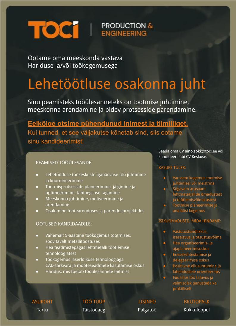 - Vähemalt 5-aastane töökogemus tootmises, soovitavalt metallitööstuses