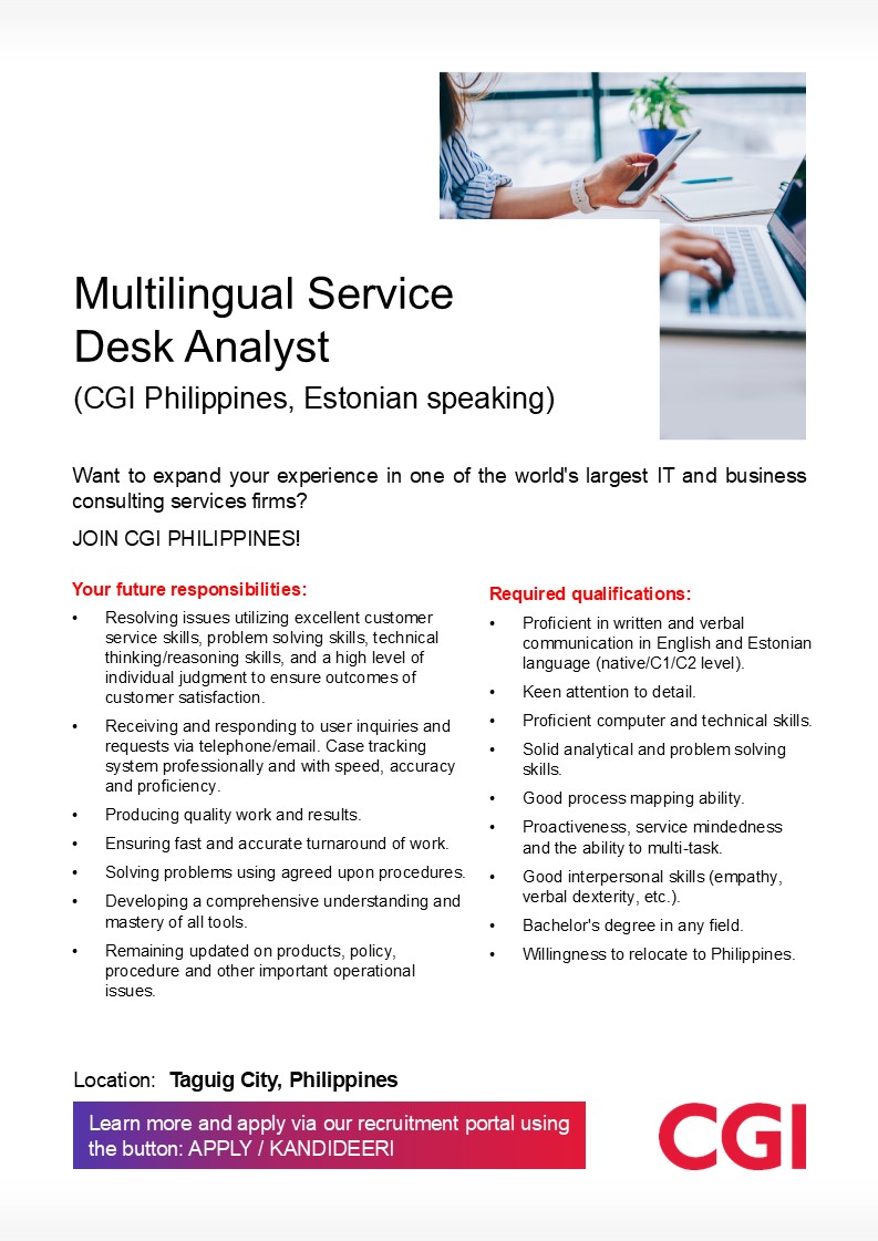 1976. aastal asutatud CGI on üks maailma suuremaid IT- ja ärinõustamisteenuste osutajaid. Tugineme pikaaegsele kogemusele, et aidata kiirendada koostööpartnerite investeeringute tasuvust. Kui Sulle on oluline töö kvaliteet, pühendunud kolleegid, Sind ümbritsev ühiskond ja põnevad väljakutsed liitu CGI-ga!