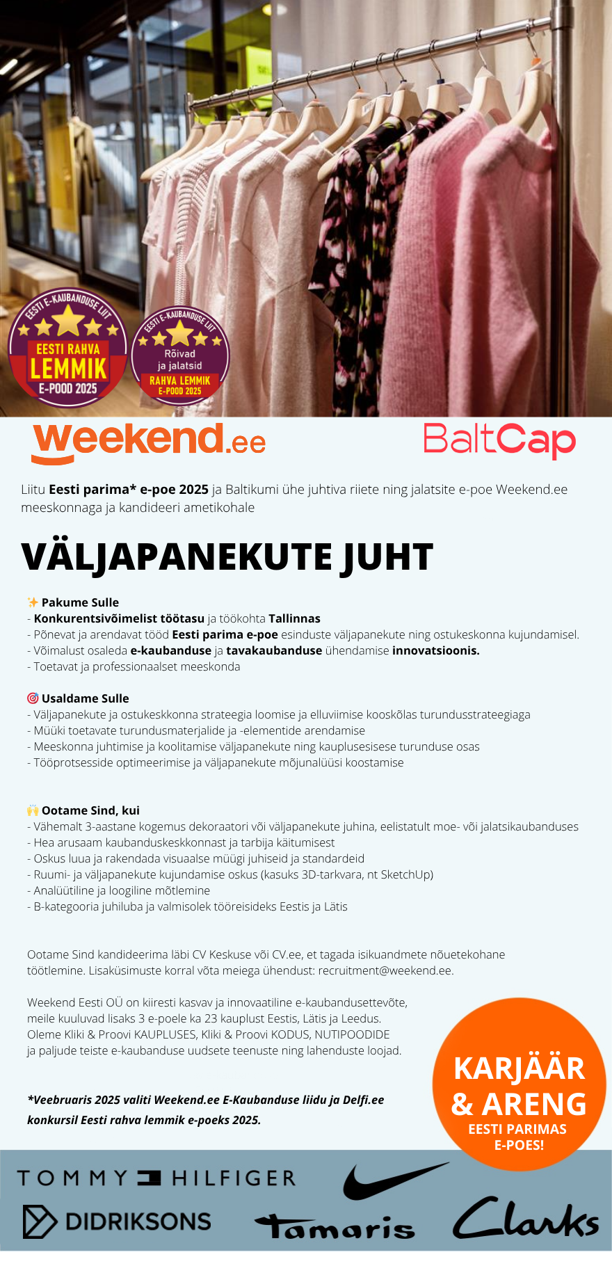 Weekend on kiiresti kasvav moe- ja jalatsikaubanduse ettevõte Baltikumis. Ühendame tavakaupluste keti ning e-kaubanduse tänu meie Kliki ja Proovi teenusele ning teeme ostlemise kiireks, mugavaks ja nauditavaks. Kui sind innustavad kaasaegsed tehnoloogiad ja soovid töötada dünaamilises keskkonnas koos professionaalse meeskonnaga, siis Weekend on õige koht, kus kasvada ja areneda.