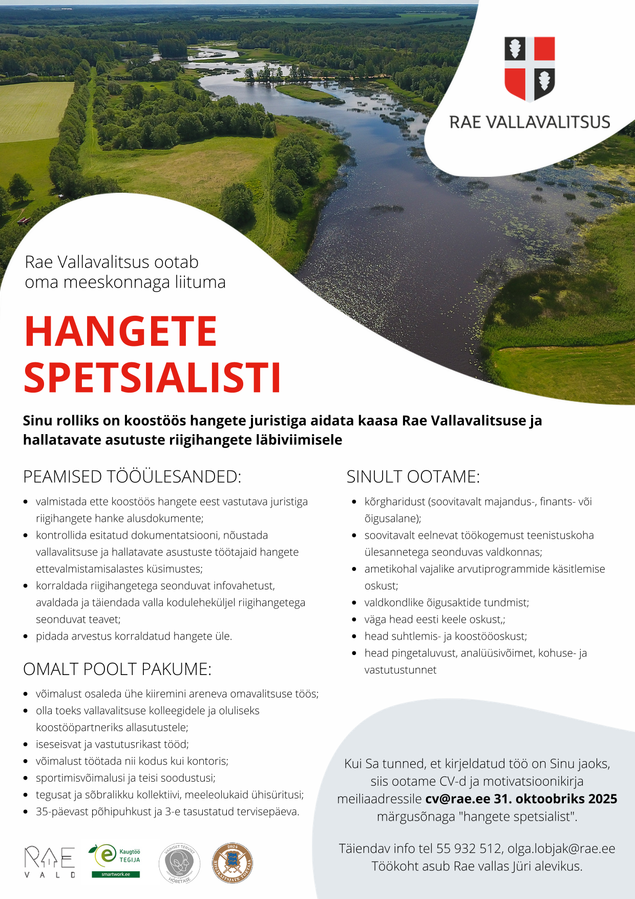 Kui Sa tunned, et kirjeldatud töö on Sinu jaoks, siis ootame CV-d ja motivatsioonikirja meiliaadressile cv@rae.ee 31. oktoobriks 2025 märgusõnaga "hangete spetsialist".