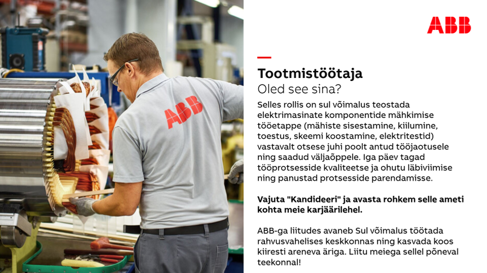 ABB on elektrifitseerimise ja automatiseerimise valdkonnas ülemaailmne tehnoloogialiider. Meie eesmärk on võimaldada jätkusuutlikumat ja ressursitõhusamat tulevikku. Ühendades oma inseneri- ja digitaliseerimisalased teadmised, aitame tööstusharudel toimida suure jõudlusega, muutudes samal ajal tõhusamaks, produktiivsemaks ja jätkusuutlikumaks, et nad edestaksid konkurente. Me nimetame seda: "Engineered to Outrun." Meil on üle maailma umbes 110 000 töötajat ja meie ajalugu ulatub enam kui 140 aasta taha.