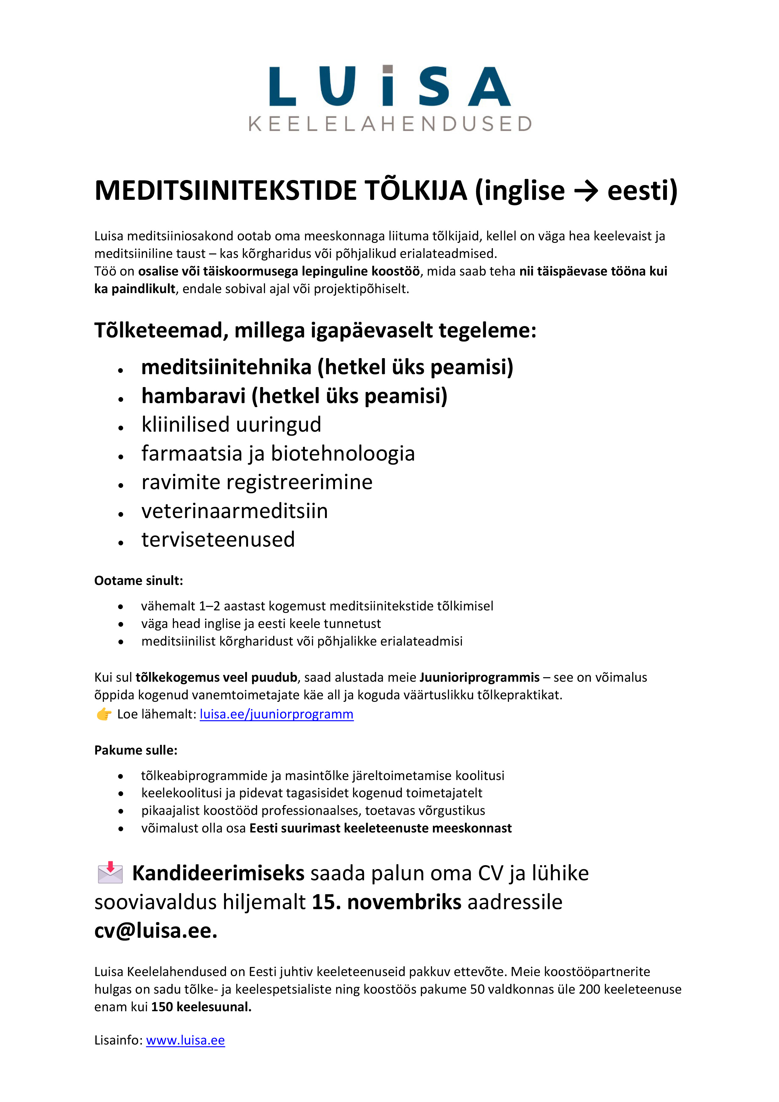 Luisa Keelelahendused on Eesti juhtiv keeleteenuseid pakkuv ettevõte. Meie koostööpartnerite hulgas on sadu tõlke- ja keelespetsialiste ning koostöös pakume 50 valdkonnas üle 200 keeleteenuse enam kui 150 keelesuunal.