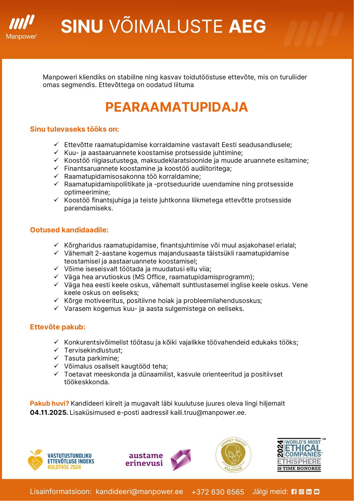 Manpower on üks tunnustatumaid personaliettevõtteid maailmas. Meil on üle 75 aasta rahvusvahelist kogemust töötajate värbamise ja renditeenuste alal. Me hoolime inimestest ja sellest, mis rolli mängib töö nende elus. Alates 2004. aastast oleme Eestis aidanud inimestel leida nende elu- ja tööstiiliga sobiva ametikoha. Kui sa alles sisened tööturule, otsid uusi väljakutseid või planeerid karjäärimuutust meie Manpoweris oskame aidata. Unistuste töö leidmine on SINU võimuses.