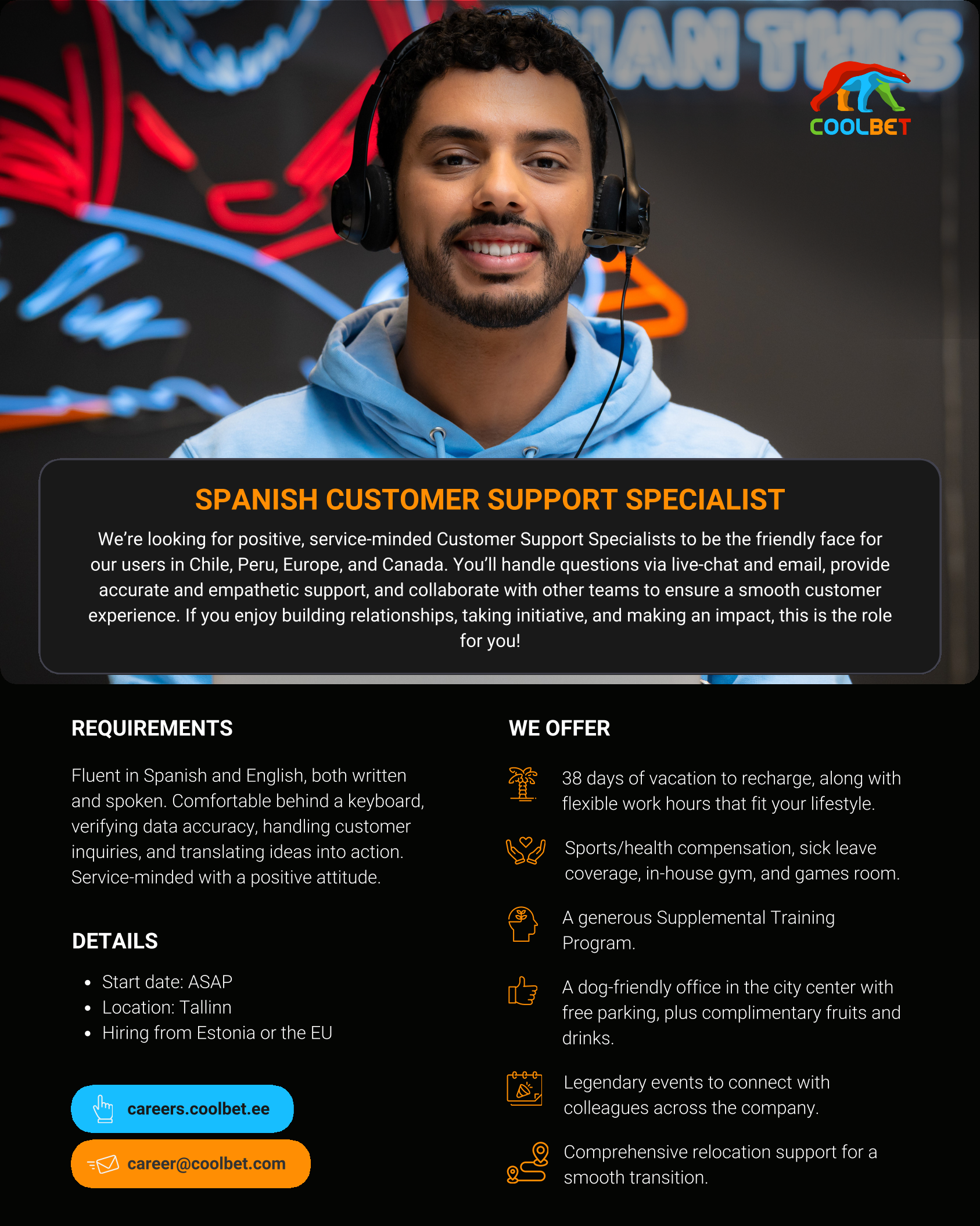 - Prefer English? Please find the ad in English here: https://careers.coolbet.ee/jobs/6365548-spanish-customer-support-specialist