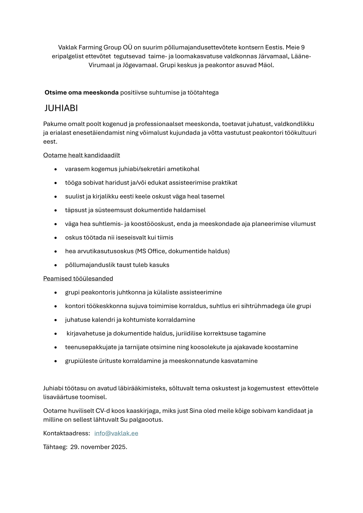 Vaklak Farming Group OÜ on suurim põllumajandusettevõtete kontsern Eestis. Meie 9
