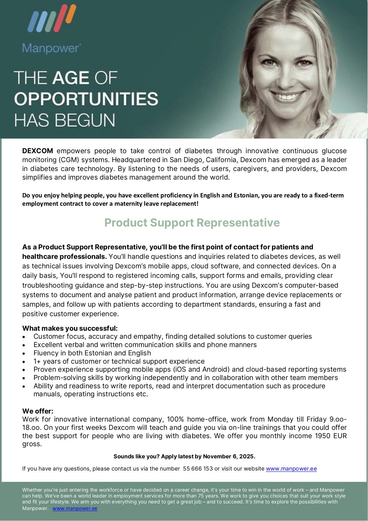 Manpower on üks tunnustatumaid personaliettevõtteid maailmas. Meil on üle 75 aasta rahvusvahelist kogemust töötajate värbamise ja renditeenuste alal. Me hoolime inimestest ja sellest, mis rolli mängib töö nende elus. Alates 2004. aastast oleme Eestis aidanud inimestel leida nende elu- ja tööstiiliga sobiva ametikoha. Kui sa alles sisened tööturule, otsid uusi väljakutseid või planeerid karjäärimuutust meie Manpoweris oskame aidata. Unistuste töö leidmine on SINU võimuses.