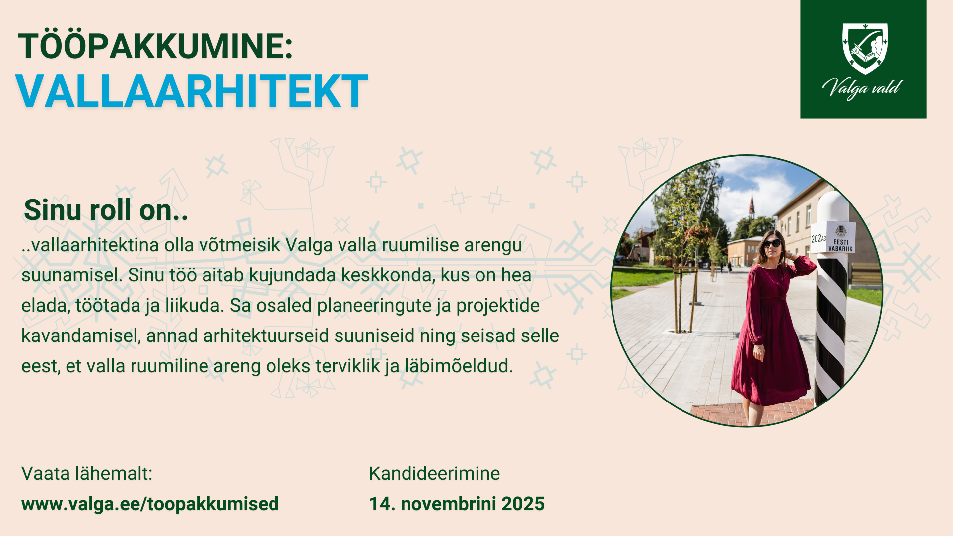Sooviavaldus, essee Valga linnaruumi arengu suuremad väljakutsed ja visioon aastaks 2035 (pikkus maksimaalselt A4, 4000 tähemärki), haridust tõendavate dokumentide koopiad, nõusolek kandidaadi taustakontrolliks ning muud dokumendid, mida kandidaat peab vajalikus esitada, palume saata hiljemalt 14. novembriks 2025 e-posti aadressil valga@valga.ee