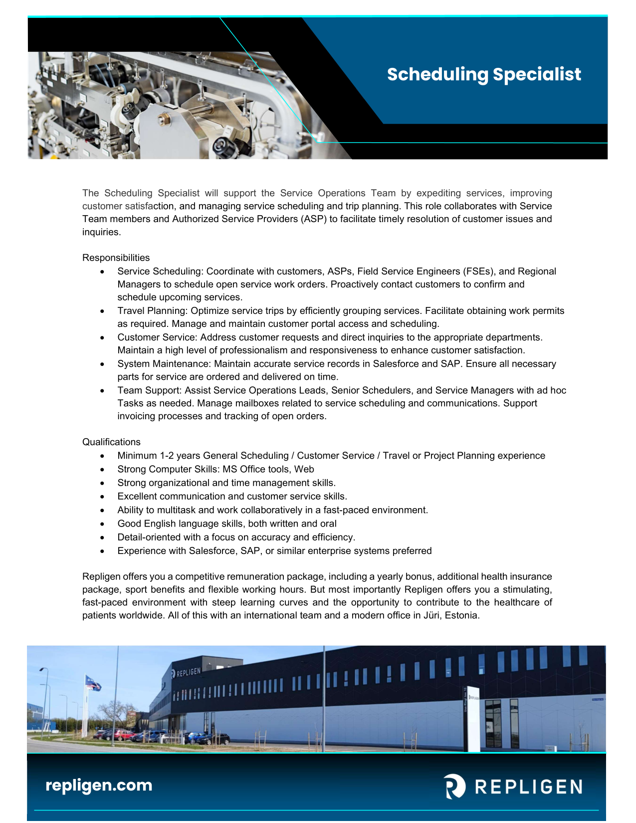 Repligen offers you a competitive remuneration package, including a yearly bonus, additional health insurance package, sport benefits and flexible working hours. But most importantly Repligen offers you a stimulating, fast-paced environment with steep learning curves and the opportunity to contribute to the healthcare of patients worldwide. All of this with an international team and a modern office in Jüri, Estonia.
