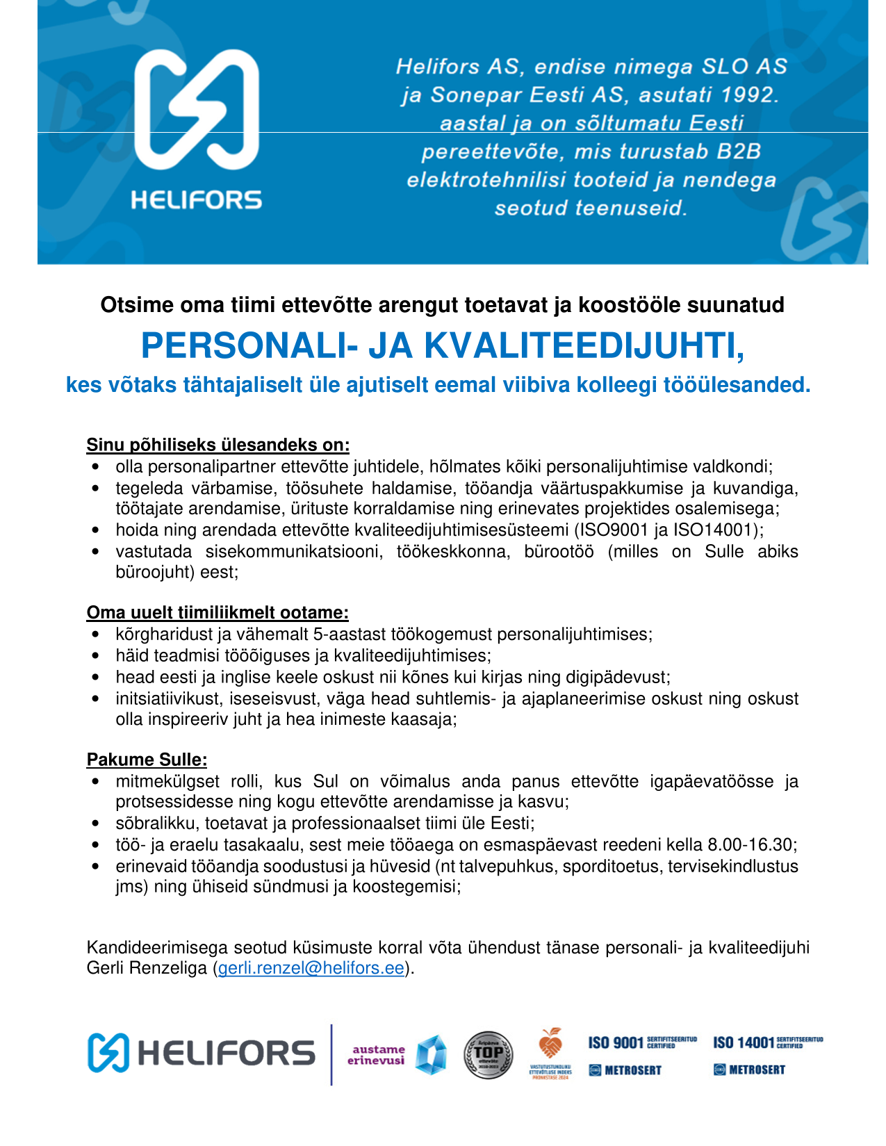 · hoida ning arendada ettevõtte kvaliteedijuhtimisesüsteemi (ISO9001 ja ISO14001);