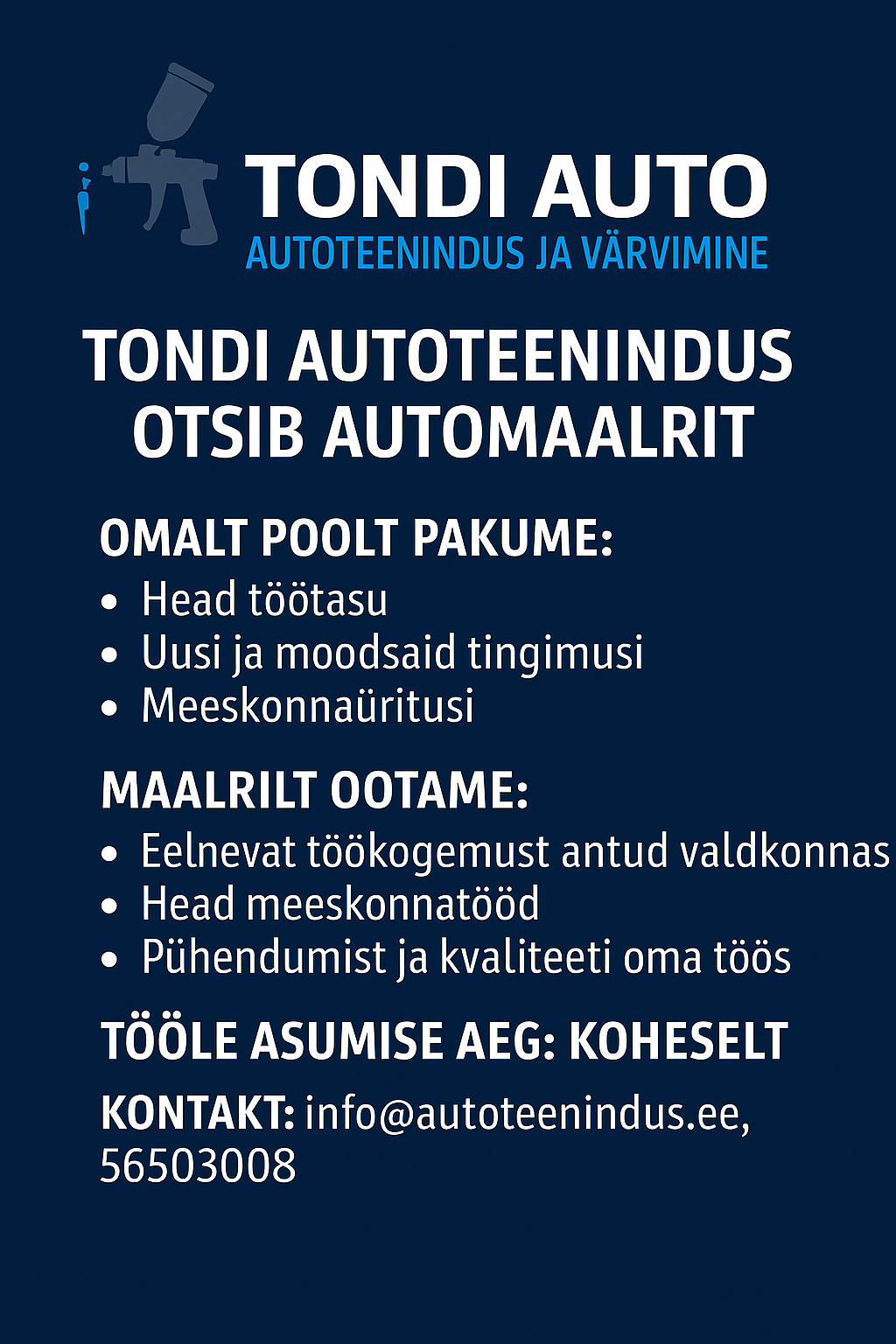 Tondi Autoteenindus on tegutsenud Eesti turul nüüdseks 25 aastat. Keskendume kvaliteetse ja usaldusväärse teenuse pakkumisele. Väärtustame oma meeskonda ning keskendume heaolulise ja effektiivse keskkonna loomisele.