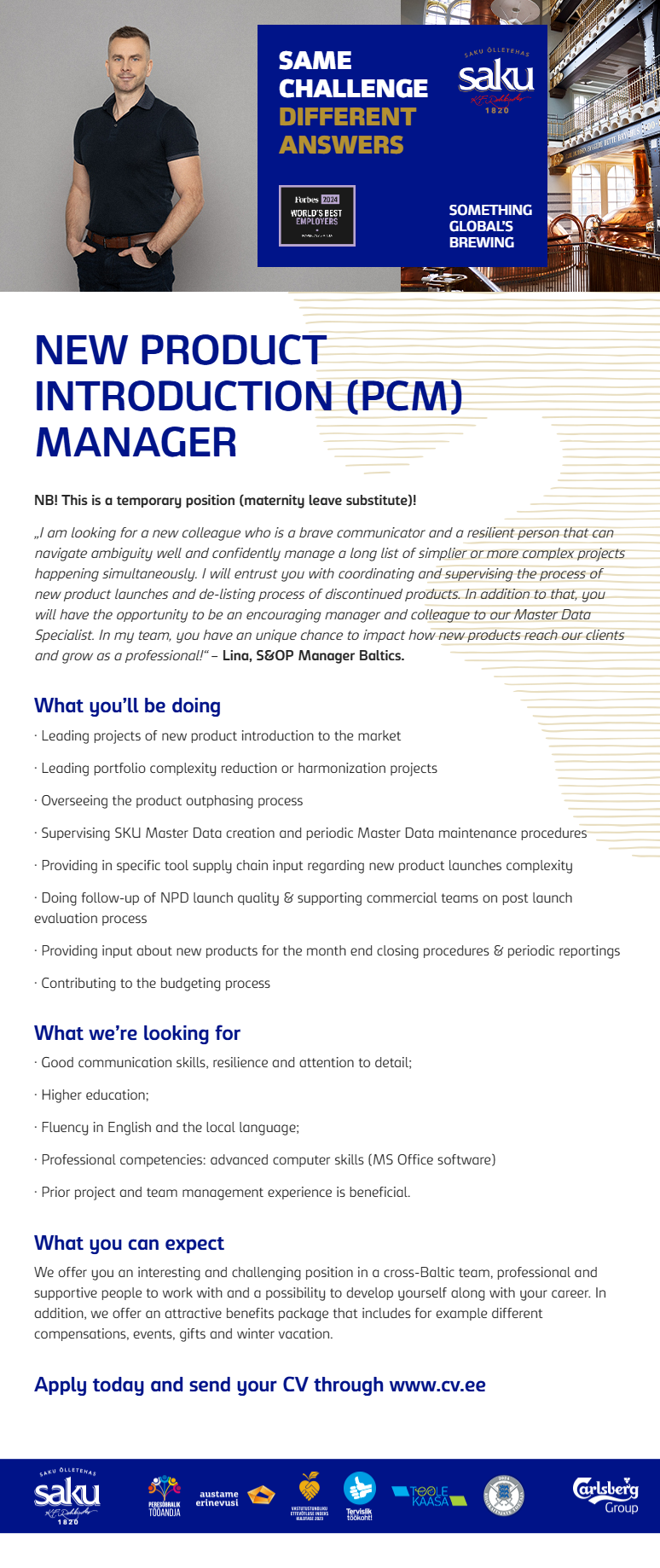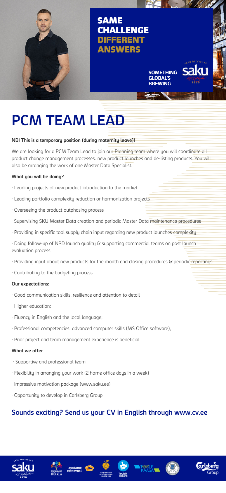 Saku Õlletehase AS-is, Carlsbergi grupi Baltikumi üksuses, ootab sind ees rahvusvahelise joogitööstuse põnev maailm. Siin töötavad oma ala tipptegijad, kes igapäevaselt pingutavad selle nimel, et meie tooted oleksid laitmatu kvaliteediga ja pakuksid unikaalseid maitseelamusi. Meie jaoks on oluline mõelda paremale tänasele ja homsele.