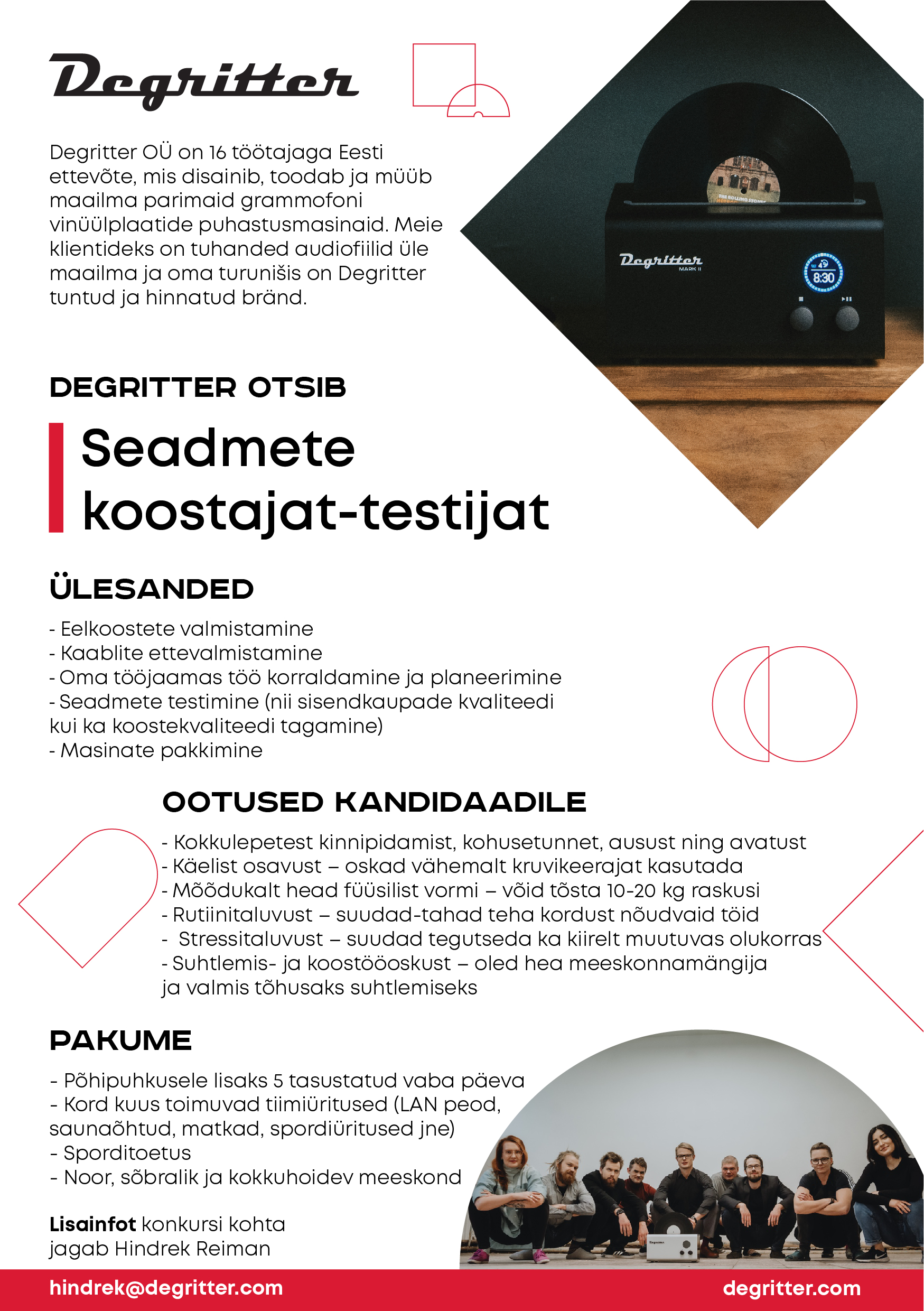 Degritter OÜ asutati 2016. aastal. Ettevõte arendab ja toodab kodukasutajale mõeldud kõrgtehnoloogilisi vinüülplaatide pesumasinaid, mida müüakse üle kogu maailma USA'st Hong-Kongini. Oleme oma valdkonnas tõusnud maailma tipptegijaks ning pälvinud mitmeid auhindu. Eriti tore oli saada Tartu 2021. aasta Startupi tiitel! Otsime oma ettevõttesse juurde seadmete koostajat- testijat. Kas Sind?