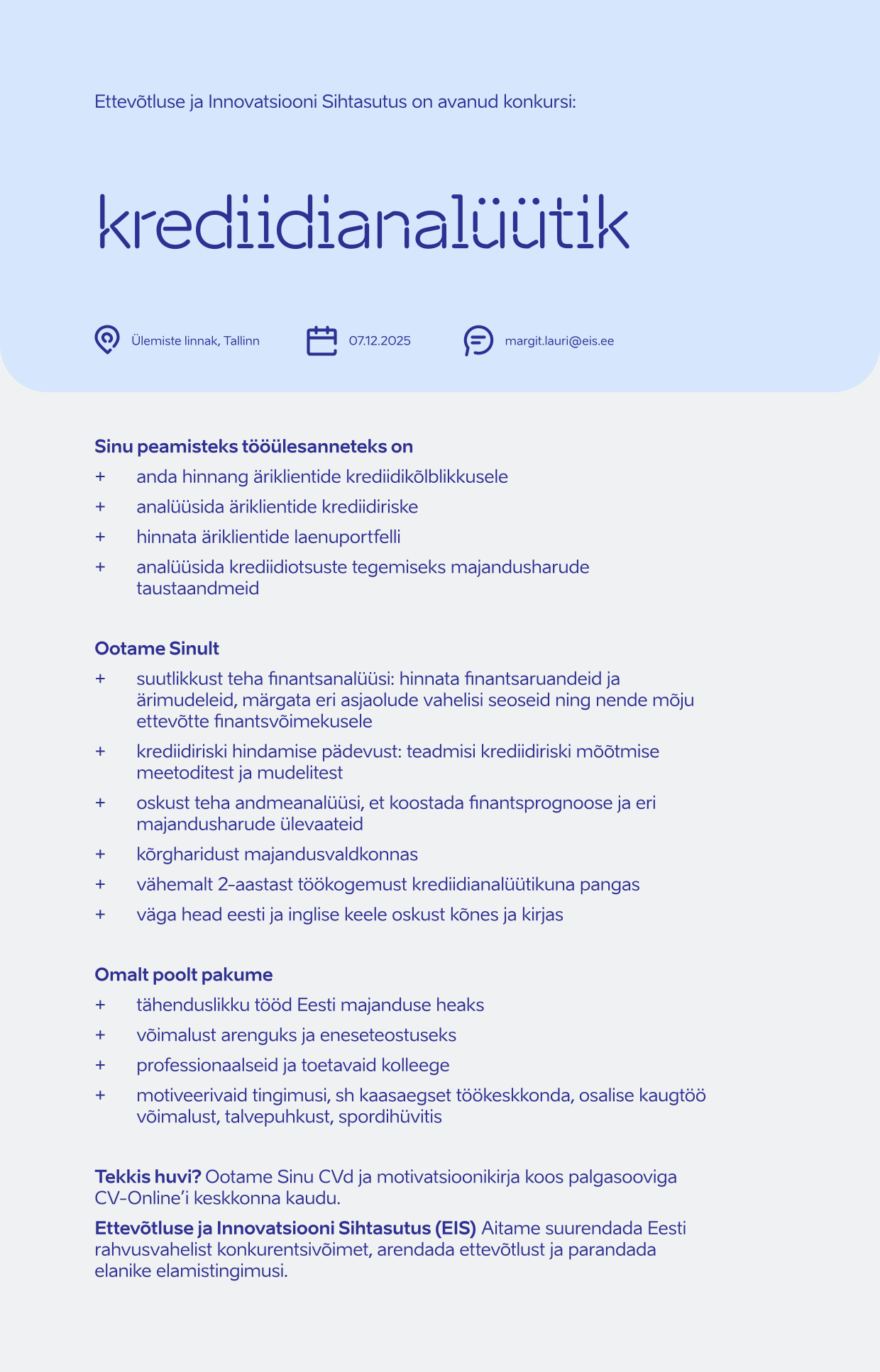 Ettevõtluse ja Innovatsiooni Sihtasutus (EIS) on riigi poolt asututatud sihtasutus, mille eesmärk on suurendada Eesti rahvusvahelist konkurentsivõimet, arendada ettevõtlust ja elukeskkonda. Aitame ettevõtetel kasvada, laieneda välisturgudele ning toetame tehnoloogiavaldkonna arengut. Meie eesmärk on muuta Eesti atraktiivseks paigaks nii ettevõtetele, tippspetsialistidele kui ka väliskülalistele. Eraisikuid toetame elamistingimuste parandamisel.