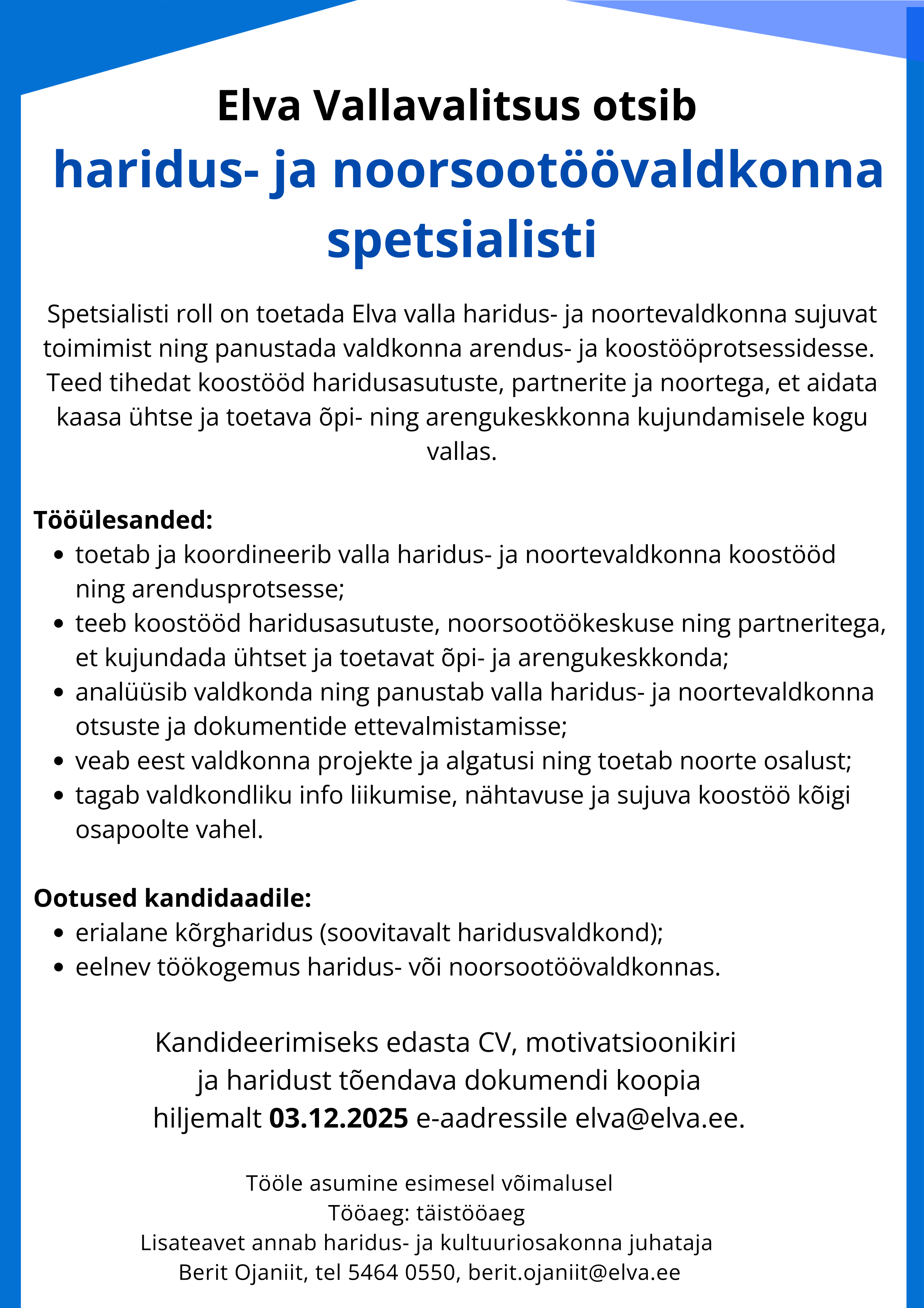 eelnev töökogemus haridus- või noorsootöövaldkonnas.