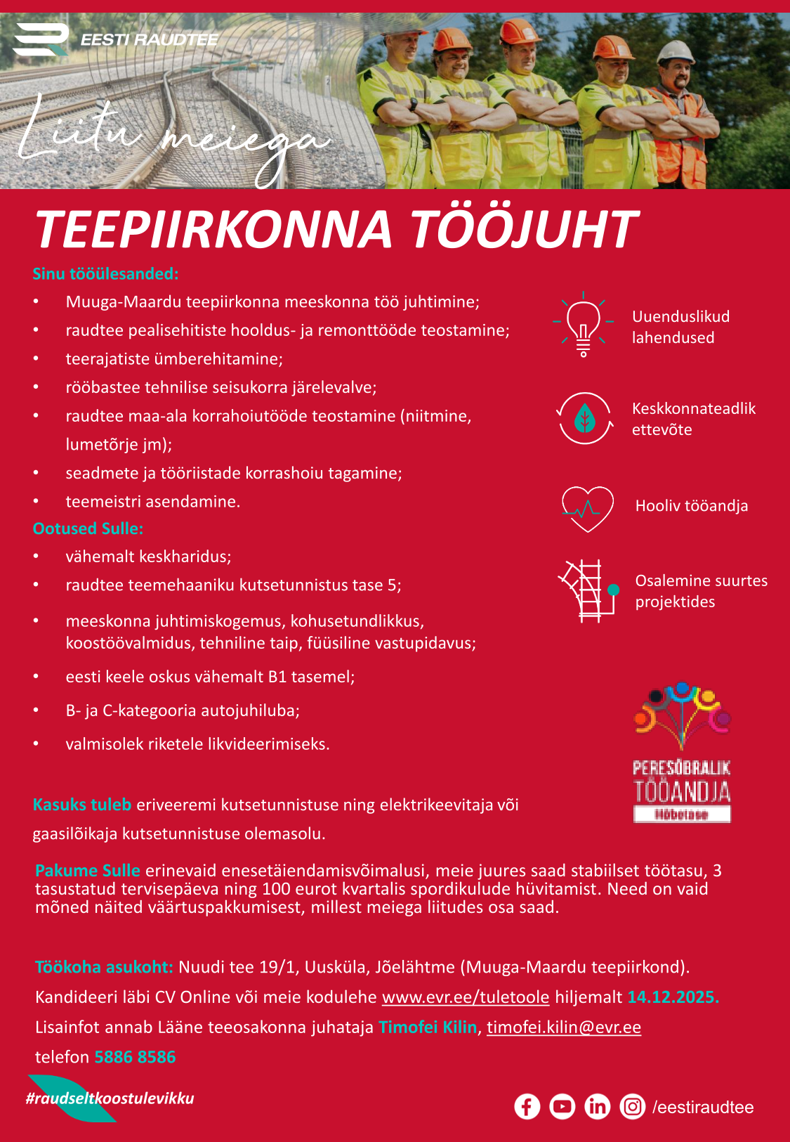 •meeskonna juhtimiskogemus, kohusetundlikkus, koostöövalmidus, tehniline taip, füüsiline vastupidavus ;