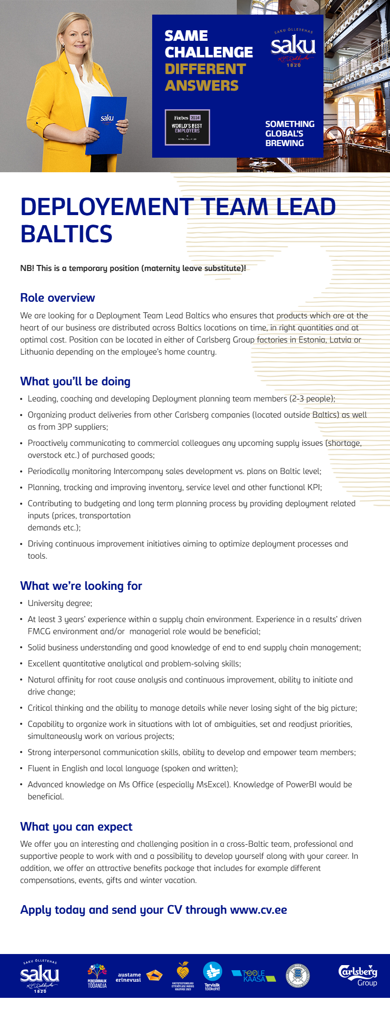 Saku Õlletehase AS-is, Carlsbergi grupi Baltikumi üksuses, ootab sind ees rahvusvahelise joogitööstuse põnev maailm. Siin töötavad oma ala tipptegijad, kes igapäevaselt pingutavad selle nimel, et meie tooted oleksid laitmatu kvaliteediga ja pakuksid unikaalseid maitseelamusi. Meie jaoks on oluline mõelda paremale tänasele ja homsele.