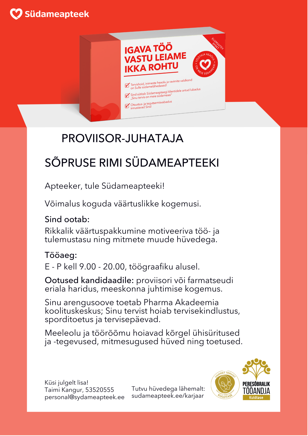 Lisahüved: Rikkalik väärtuspakkumine motiveeriva töö- ja tulemustasu, arengusoove toetab Pharma Akadeemia koolituskeskus. Sinu tervist hoiab tervisekindlustus, sporditoetus ja tervisepäevad. Ühisüritused, mitmesugused hüved ja toetused.