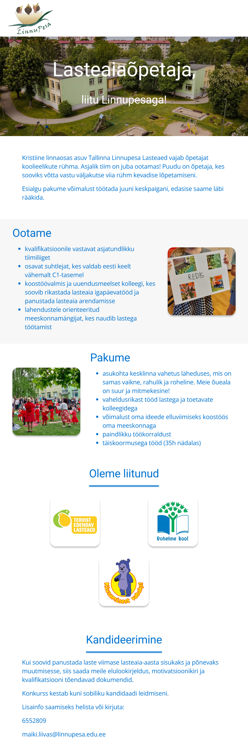 Linnupesa lasteaed asub Tallinnas Kristiine linnaosas vaikses ja rohelises piirkonnas. Lasteaias on 10 rühma ja kõikide rühmade õppekeeleks on eesti keel. Lasteaed on avatud 7.00-19.00. Meie väärtused on julgus, austus, sallivus ja hoolivus. Lasteaia tugevused on suur ja roheline õueala, põnev Rohelise Kooli programm ja mitmeaastane kogemus Euroopa vabatahtlike noorte vastuvõtmisel.