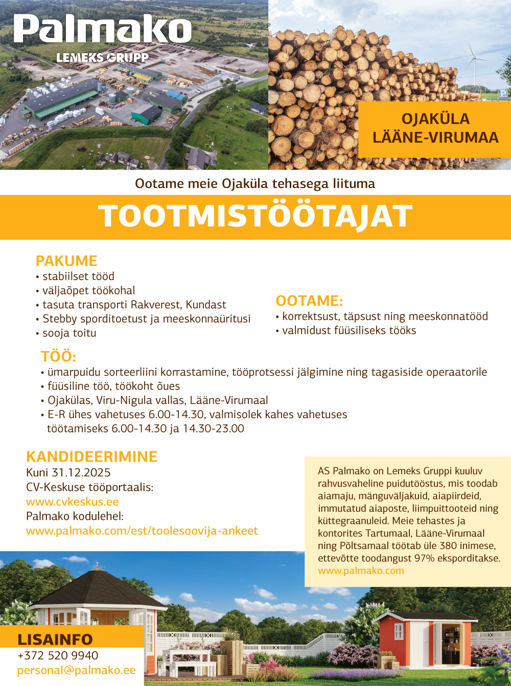 AS Palmako on Lemeks Gruppi kuuluv rahvusvaheline puidutööstus, mis toodab aiamaju, mänguväljakuid, aiapiirdeid, immutatud aiaposte, liimpuittooteid ning küttegraanuleid. Meie tehastes ja kontorites Tartumaal, Lääne-Virumaal ning Põltsamaal töötab üle 380 inimese, ettevõtte toodangust 97% eksporditakse.www.palmako.com