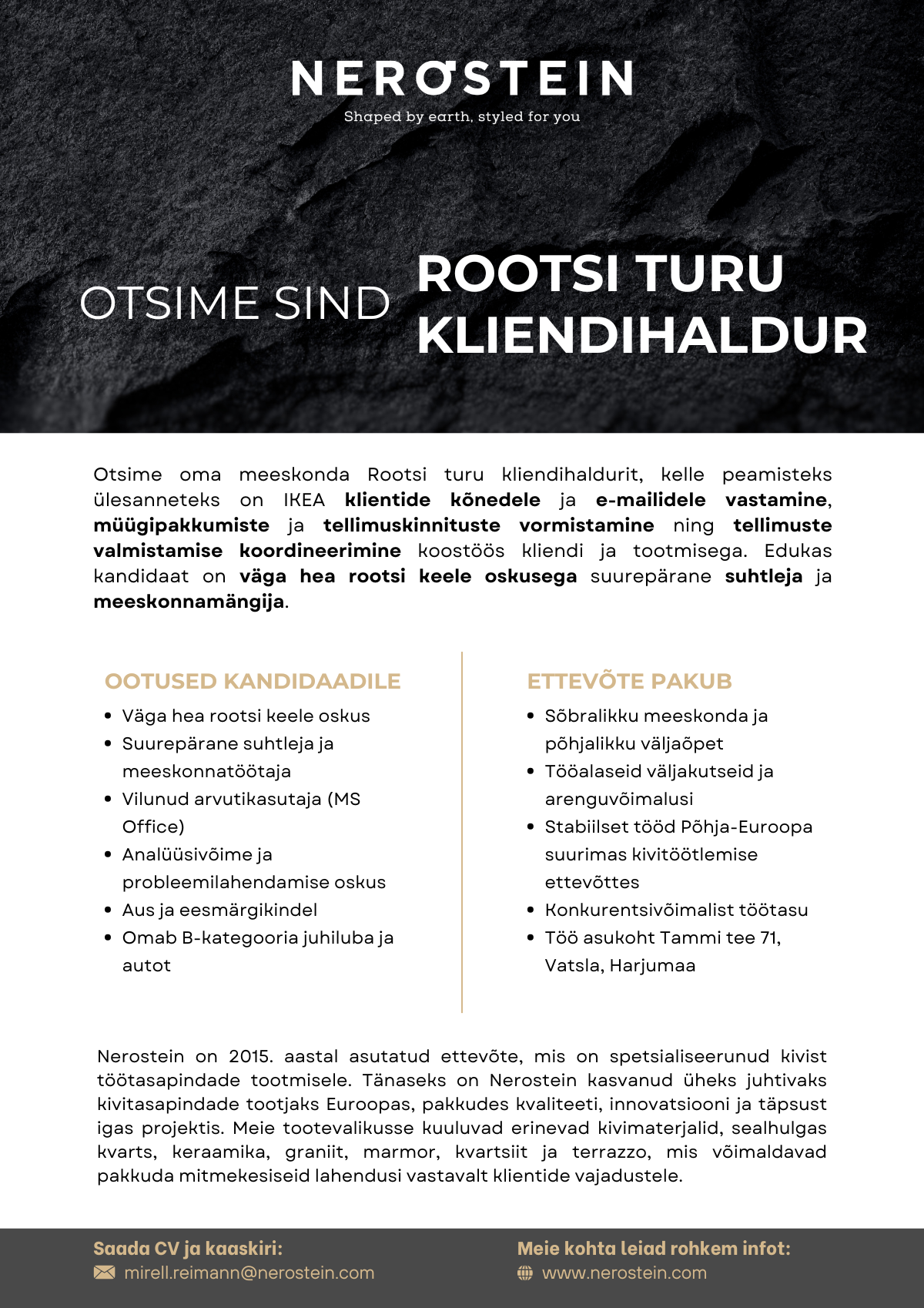 Nerostein OÜ on Põhja-Euroopa suurim kivitöötlemisettevõte, mis toodab kivist (looduskivi, kvarts, keraamika) töötasapindu. Toodangust 90% läheb ekspordiks Skandinaaviamaadesse, Prantsusmaale, Suurbritanniasse ja teistesse välisriikidesse. Samuti oleme tegevad oma koduturul Eestis. Seoses ettevõtte kiire kasvuga otsime oma meeskonda:
