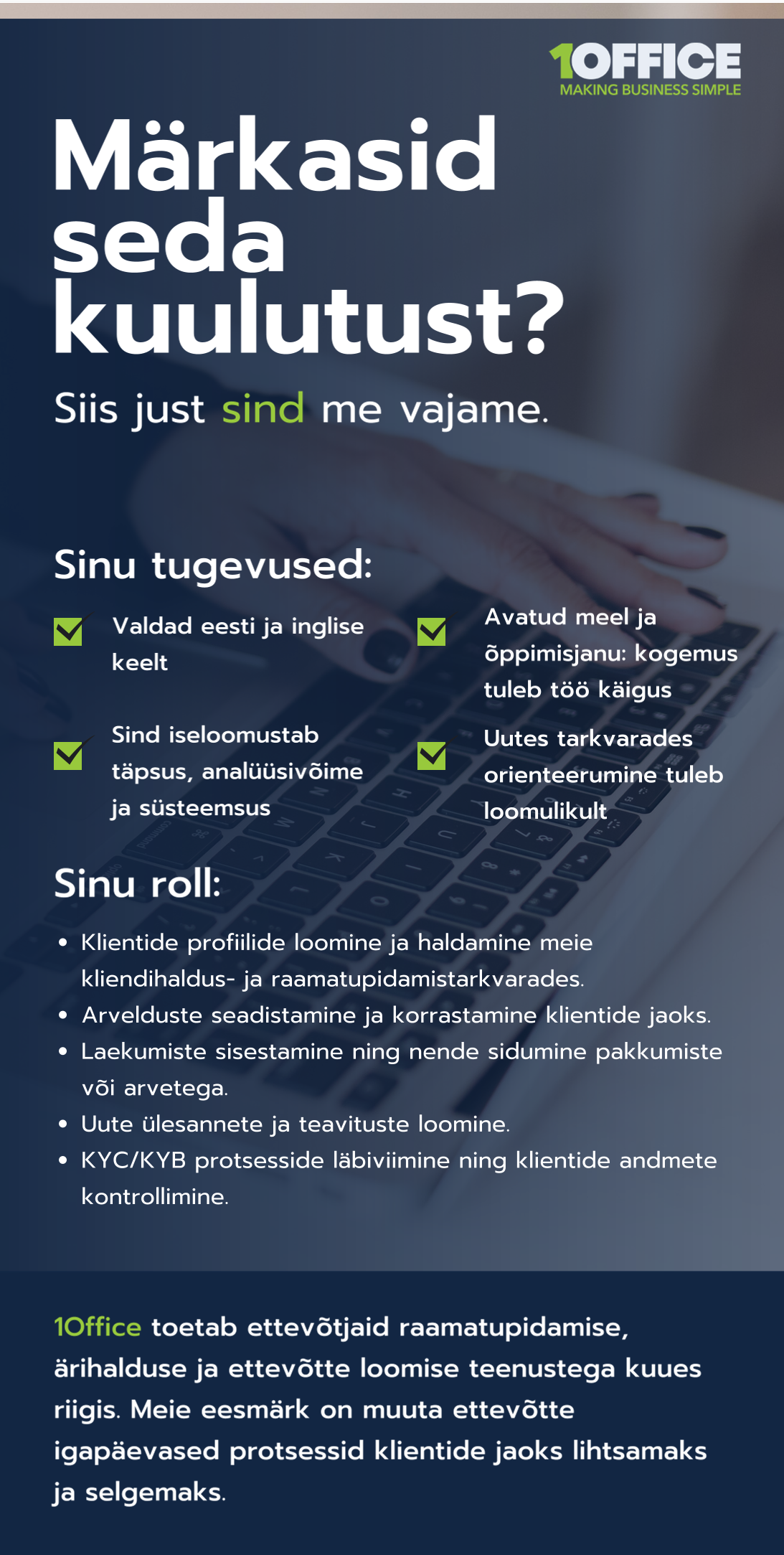 1Office Group on olnud üle 17 aasta usaldusväärne partner asukohast sõltumatutele ettevõtjatele ja äridele, lihtsustades globaalset tegevust. Rohkem kui 50 oskusliku spetsialistiga raamatupidamise, õiguse, maksunduse ja tugiteenuste valdkonnas sujuvamaks me tagakontori ülesanded, võimaldades klientidel keskenduda oma põhitegevusele.