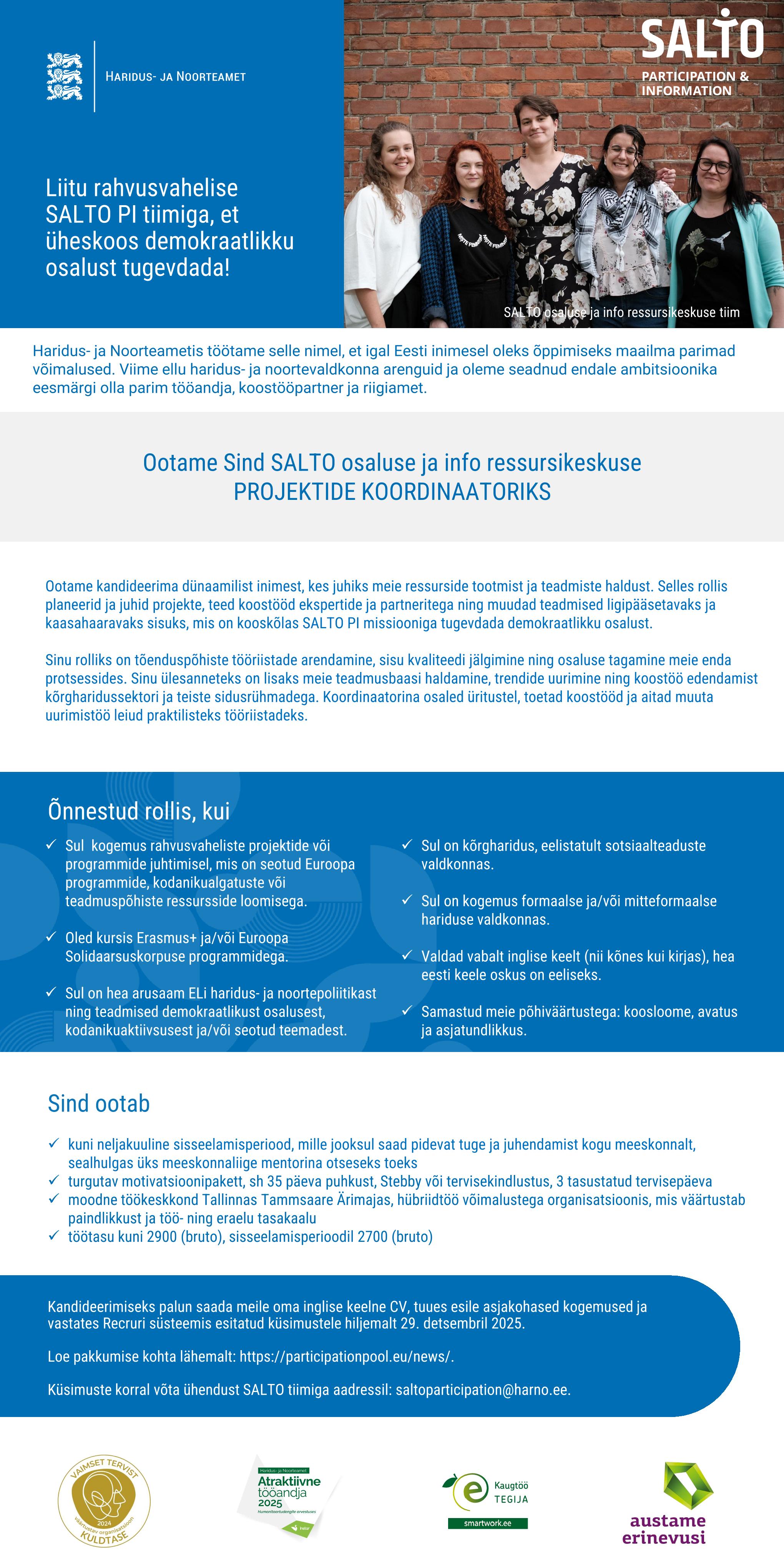 Haridus- ja Noorteametis töötame selle nimel, et igal Eesti inimesel oleks õppimiseks maailma parimad võimalused. Viime ellu haridus- ja noortevaldkonna arenguid ja oleme seadnud endale ambitsioonika eesmärgi olla parim tööandja, koostööpartner ja riigiamet.
