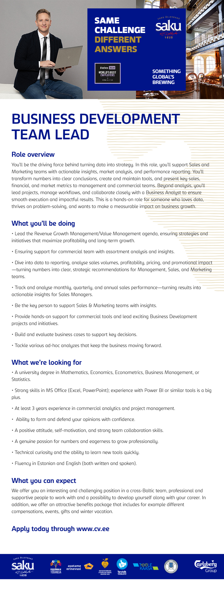 Saku Õlletehase AS-is, Carlsbergi grupi Baltikumi üksuses, ootab sind ees rahvusvahelise joogitööstuse põnev maailm. Siin töötavad oma ala tipptegijad, kes igapäevaselt pingutavad selle nimel, et meie tooted oleksid laitmatu kvaliteediga ja pakuksid unikaalseid maitseelamusi. Meie jaoks on oluline mõelda paremale tänasele ja homsele.