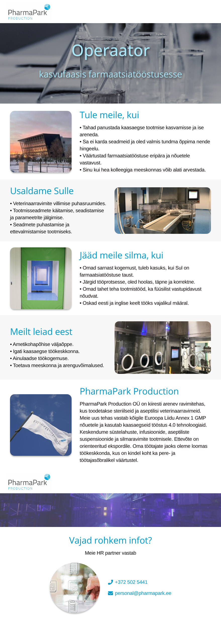 Pharmapark Production OÜ on kiiresti arenev ravimitehas, kus toodetakse steriilseid ja aseptilisi veterinaarravimeid. Meie uus tehas vastab kõigile Euroopa Liidu Annex 1 GMP nõuetele ja kasutab kaasaegseid tööstus 4.0 tehnoloogiaid. Keskendume süstelahuste, infusioonide, aseptiliste suspensioonide ja silmaravimite tootmisele. Ettevõte on orienteeritud ekspordile. Oma töötajate jaoks oleme loomas töökeskkonda, kus on kindel koht ka pere- ja töötajasõbralikel väärtustel.