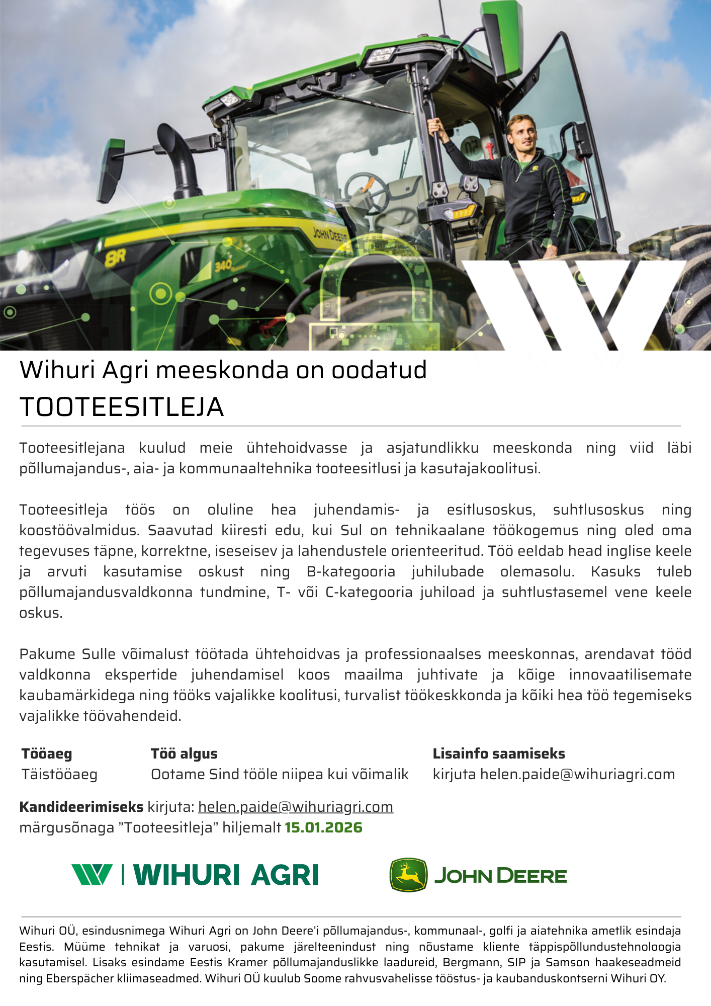 Wihuri OÜ, esindusnimega Wihuri Agri on John Deere’i põllumajandus-, kommunaal-, golfi ja aiatehnika ametlik esindaja Eestis. Müüme tehnikat ja varuosi, pakume järelteenindust ning nõustame kliente täppispõllundustehnoloogia kasutamisel.