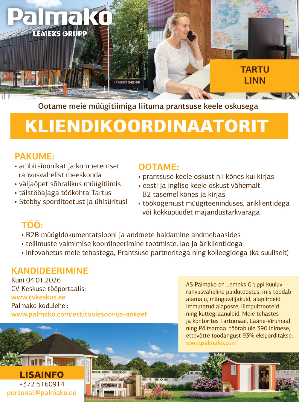 AS Palmako on Lemeks Gruppi kuuluv rahvusvaheline puidutööstus, mis toodab aiamaju, mänguväljakuid, aiapiirdeid, immutatud aiaposte, liimpuittooteid ning küttegraanuleid. Meie tehastes ja kontorites Tartumaal, Lääne-Virumaal ning Põltsamaal töötab üle 380 inimese, ettevõtte toodangust 97% eksporditakse.www.palmako.com