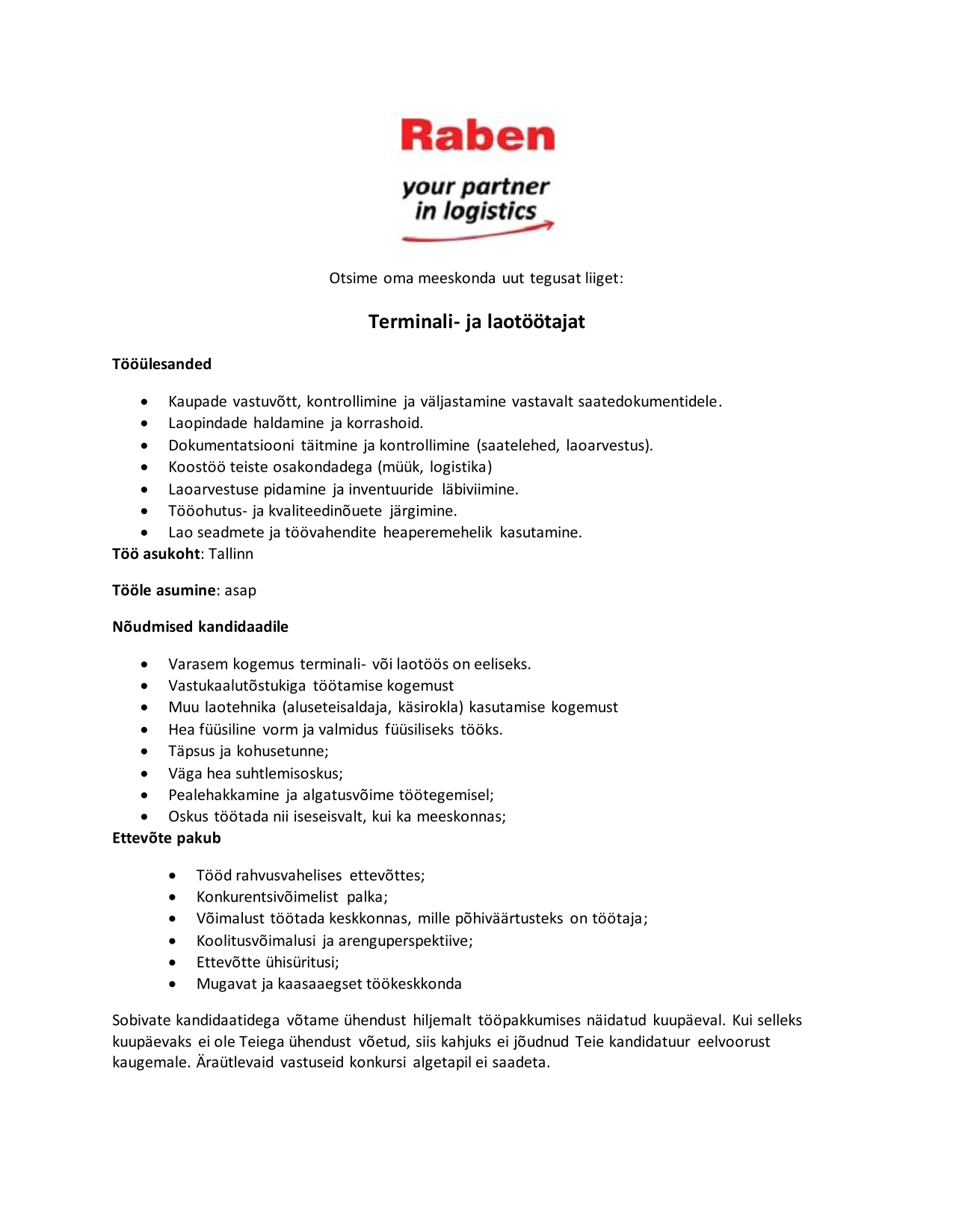 Raben Group pakub osa- ja täiskoormate veoteenuseid nii rahvusvaheliselt kui ka Eesti piires. Ettevõtte ajalugu ulatub 1931. aastasse Hollandis, kuid tänapäeval asub Rabeni peakontor Poolas. Eestis alustasime tegevust 2004. aastal. Rabeni kontorid ja terminalid tegutsevad kümnes riigis: Hollandis, Poolas, Ukrainas, Eestis, Lätis, Leedus, Saksamaal, Tšehhis, Slovakkias, Ungaris ja Rumeenias.
