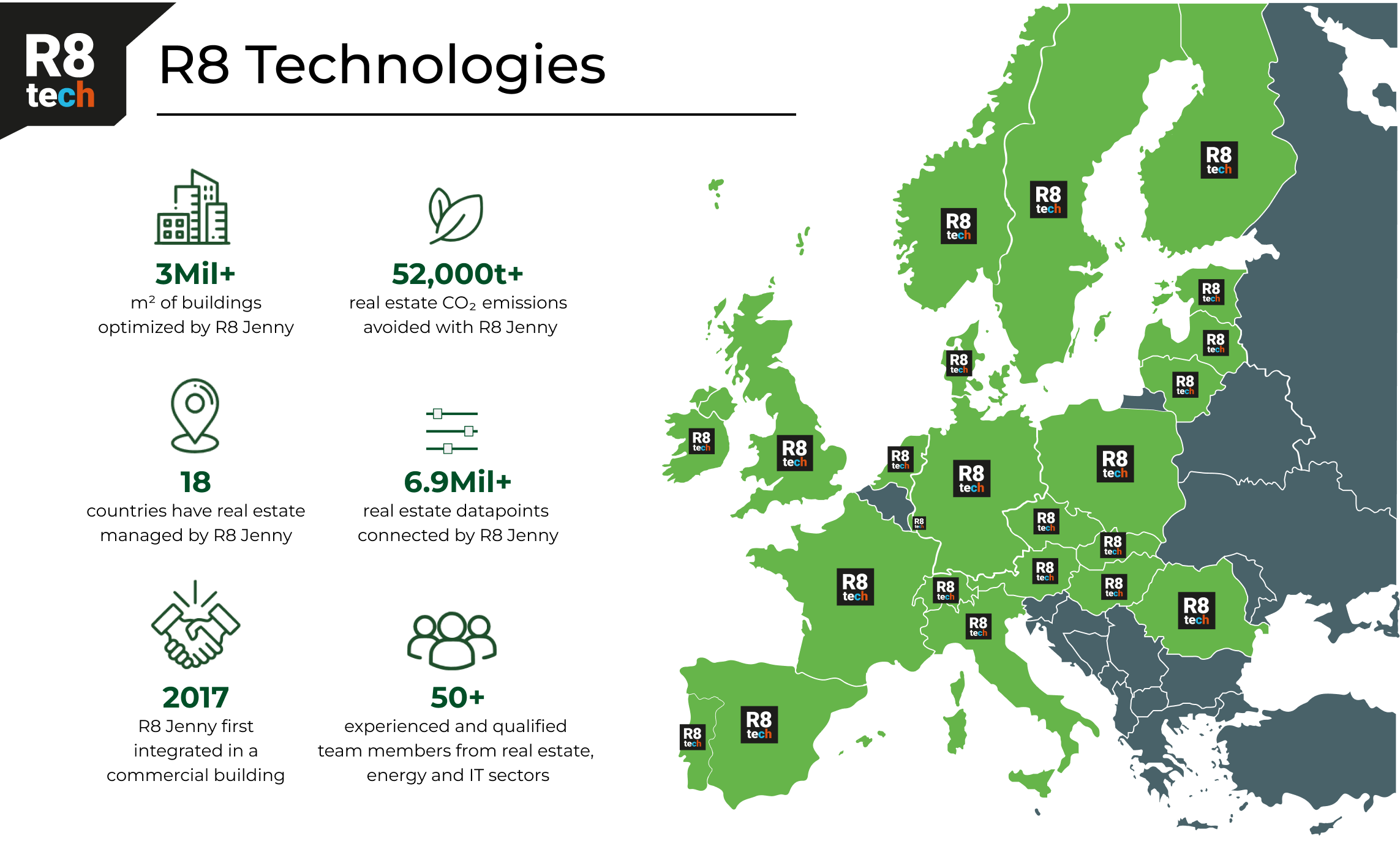 R8tech is the leading AI technology company that manages over 5Mil+ m² of commercial real estate across Europe. Using R8 Digital Operator, a data-driven AI solution, R8tech helps enhance building operations of real estate properties, including office and public buildings, shopping malls, and hotels. R8 Digital Operator allows to reduce building operational expenses, increase in property value, upgrade building energy class, reduce CO2 emissions, and achieve sustainability compliance.