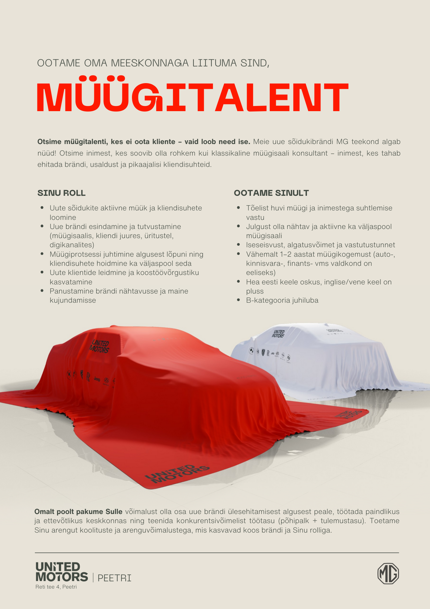 United Motors AS on Eestis juhtiv ja pikaajalise kogemusega automüügi- ning teenindusettevõte, mille portfelli kuuluvad maailmas tunnustatud automargid nagu BMW, MINI, Jeep, Peugeot, Opel, KIA, Citroen, Alfa Romeo, Fiat Professional, MG ning Rolls-Royce. Lisaks uutele autodele pakume ka vähekasutatud ning garantiilisi sõidukeid, olles usaldusväärne partner igale kliendile. Meie tegevuse aluseks on väärtuspõhine kultuur, kus võtmesõnadeks on hoolivus, pühendumus, usaldusväärsus ja uuenduslikkus. United Motors on rohkem kui lihtsalt autokeskus oleme partner ja sõber, kellega koos edasi liikuda.
