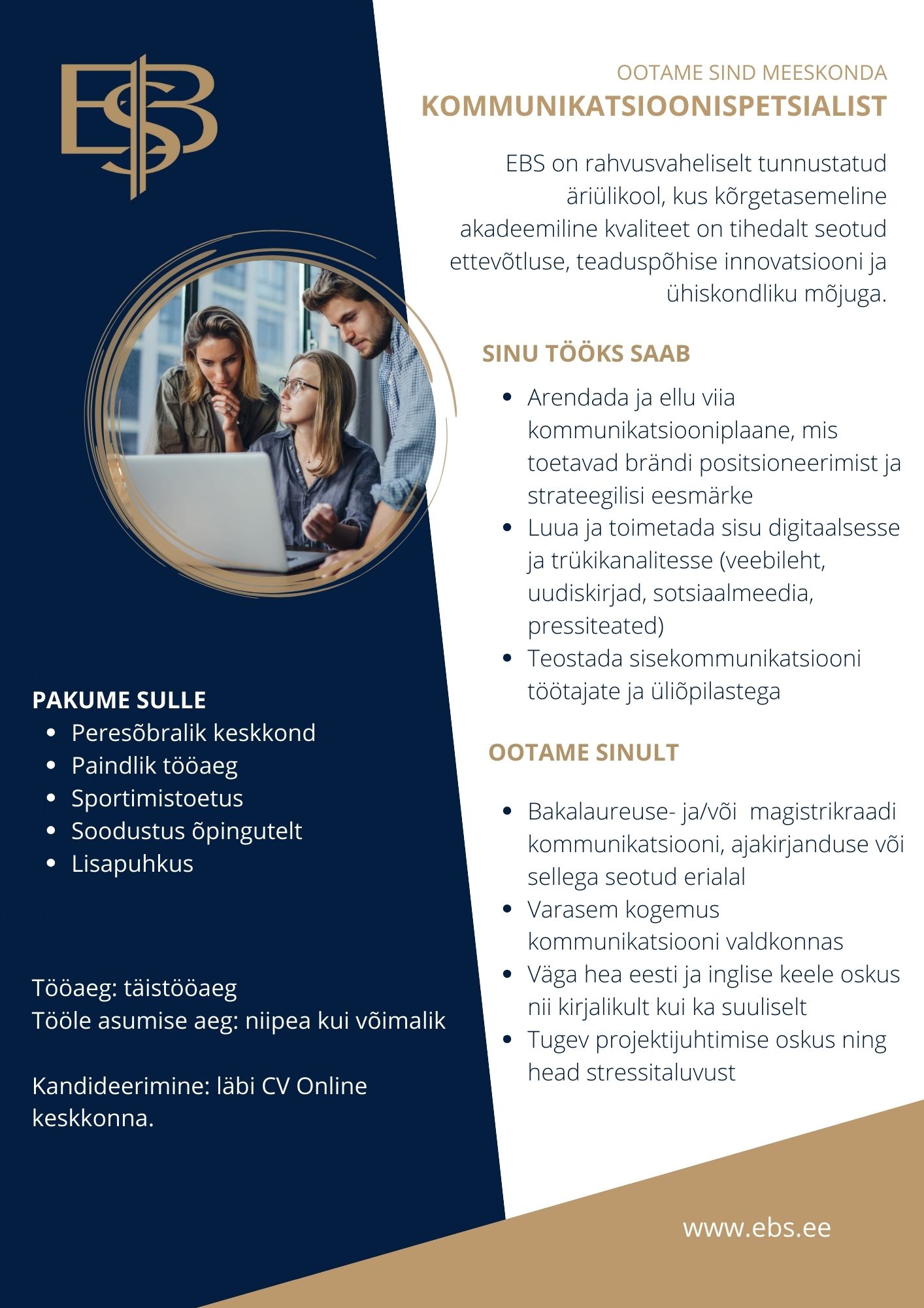 Estonian Business School (EBS) on vanim äriharidust pakkuv ülikool Baltimaades.EBSis õpib üle 1100 üliõpilase, kes hindavad ettevõtlikku mõtteviisi, rahvusvahelist õpikeskkonda ja õppimist, mis on tihedalt seotud päriseluga.